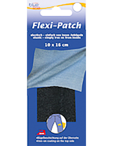 Mörkblå jeanslaglapp i stretchmaterial med klister på ovansidan för att laga från insidan.