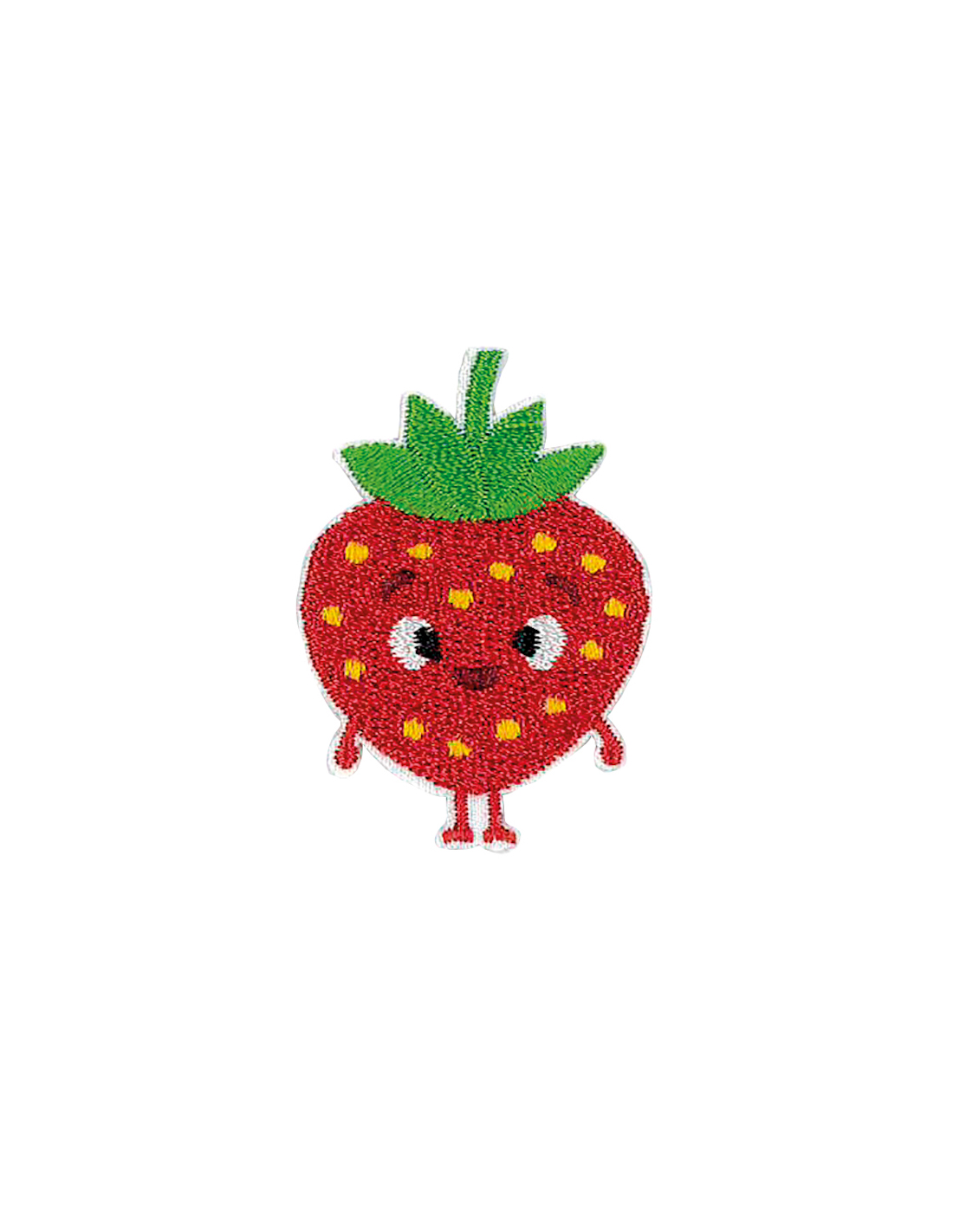 Tygmärke att stryka fast i form av en jordgubbe med ögon och armar.