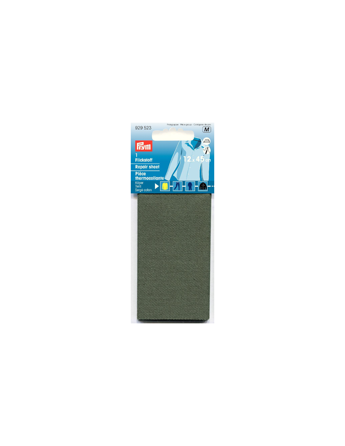 Reparationslapp i grönt grövre tyg som kan strykas och sys på för reparation av slitna fläckar på klädesplagg av jeans och twilltyger.