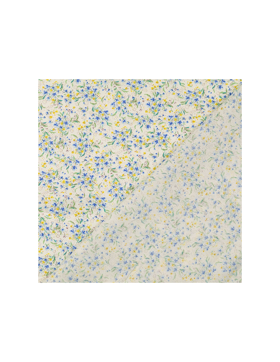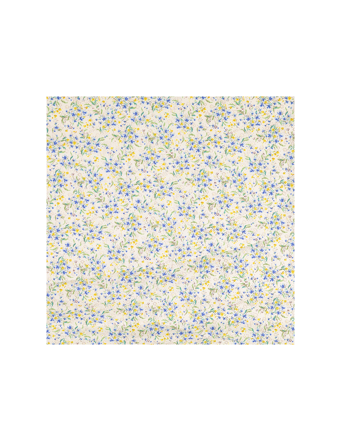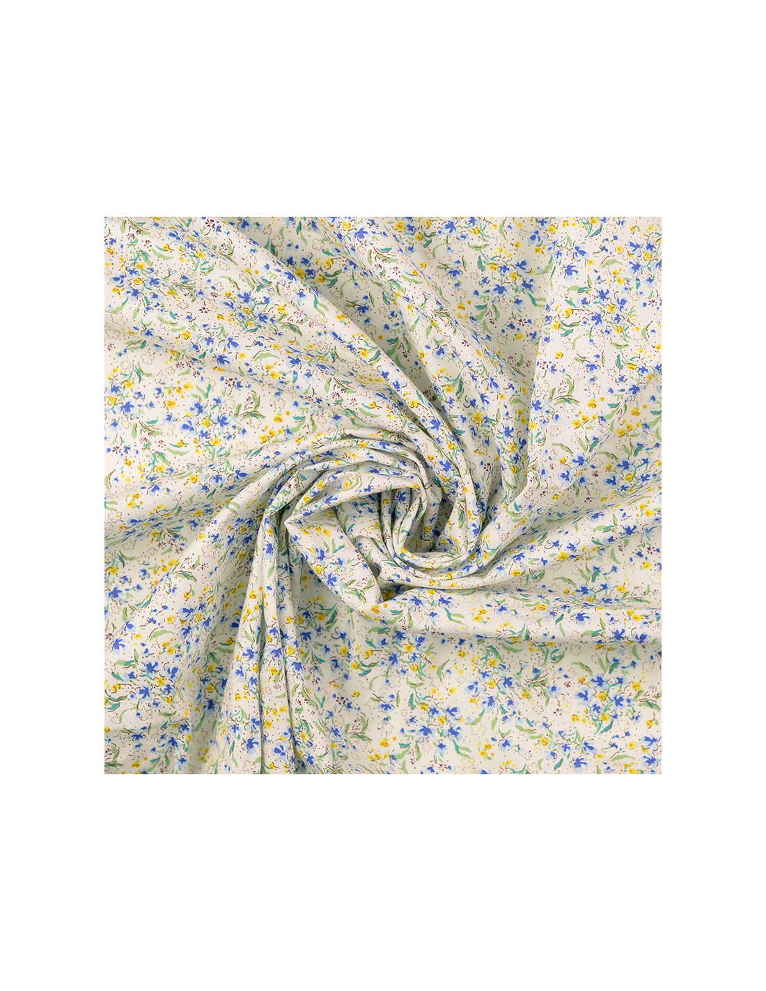 Offwhite bomullspoplin med blommor och blad i blått, gult och grönt. Tunt bomullstyg som passar till sömnad av blusar, skjortor, klänningar, kjolar m.m.