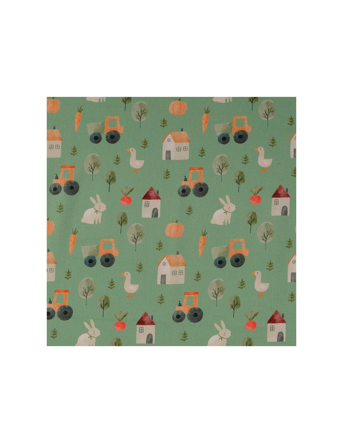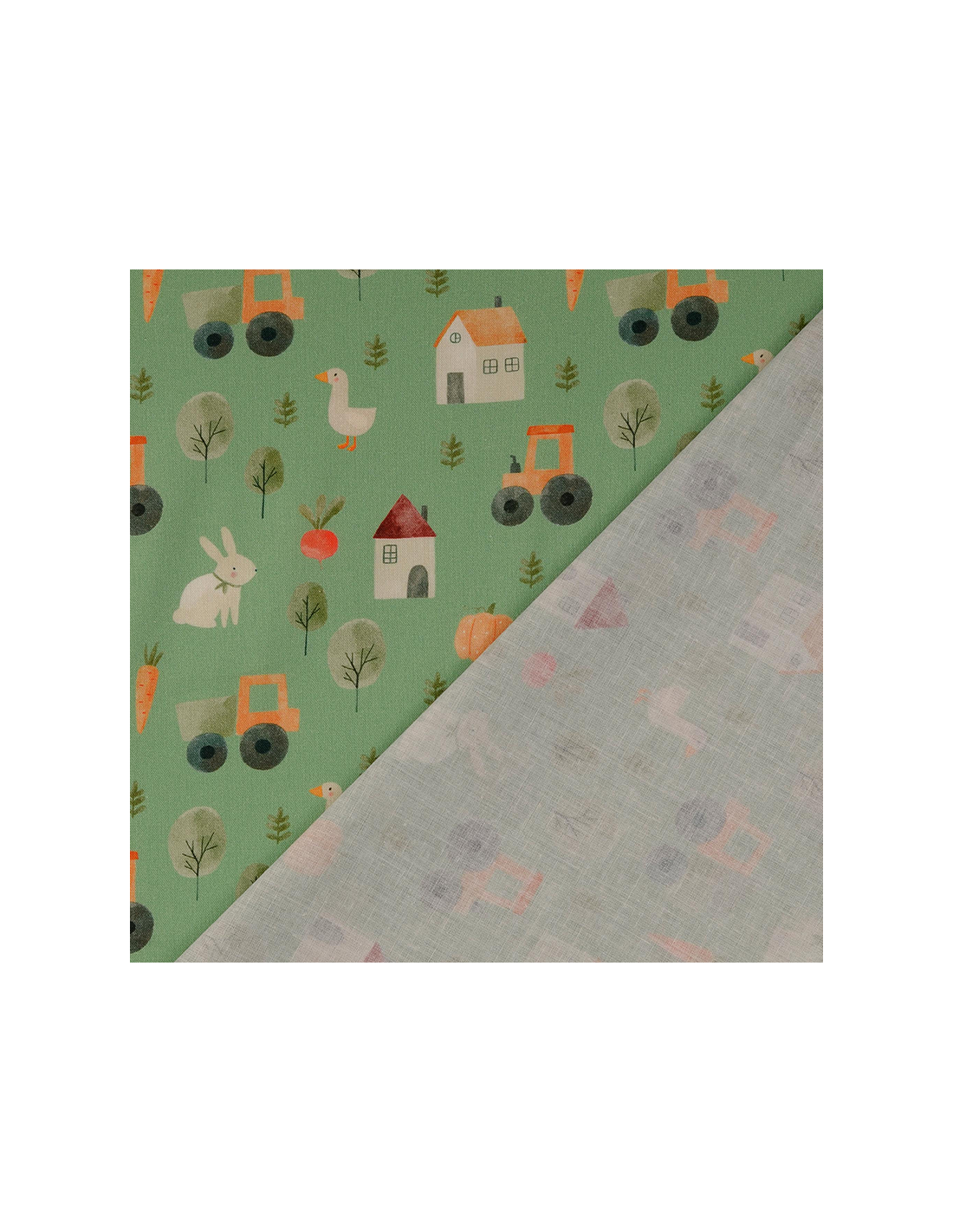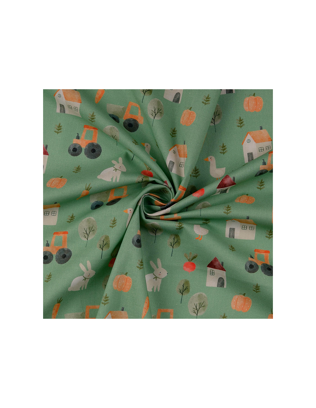 Grön bomullspoplin med djur, fordon och ätbart från en farm. Tunt bomullstyg som passar till sömnad av kuddar, gardiner, skjortor, klänningar m.m.