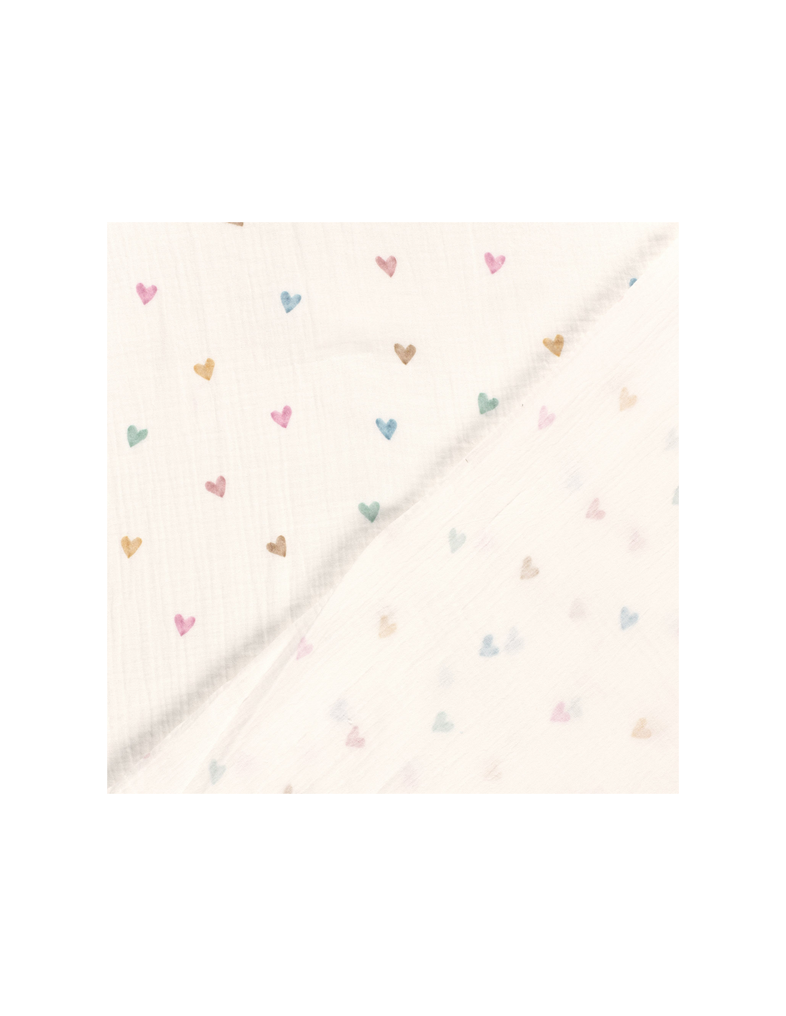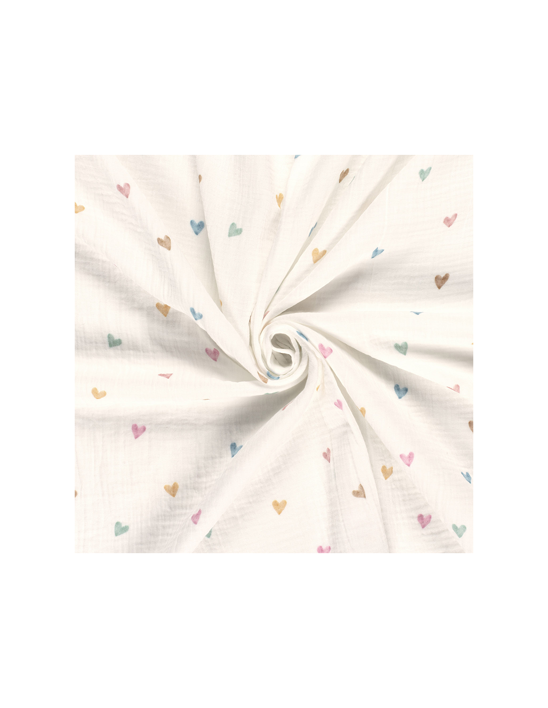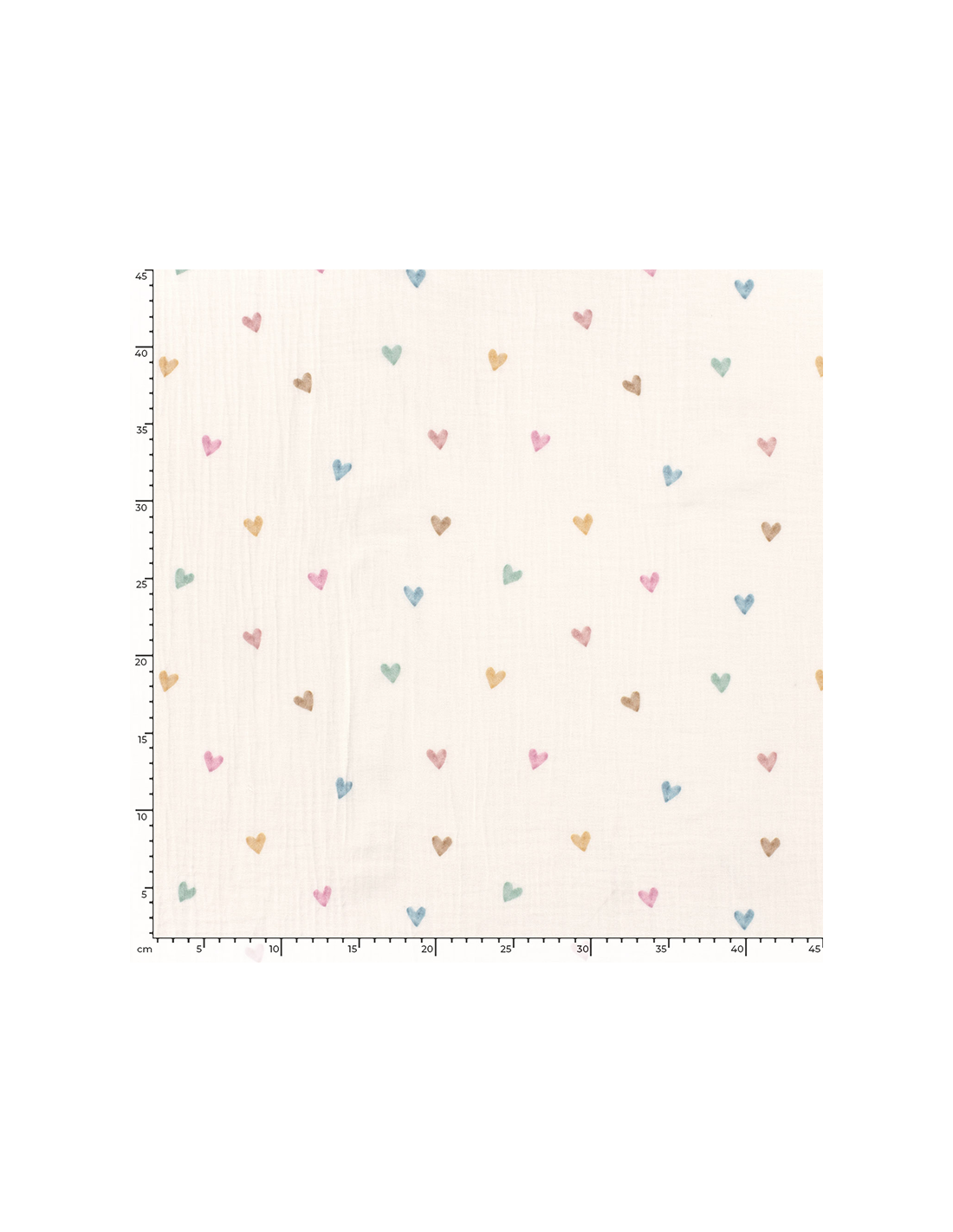 Offwhite muslin med hjärtan i olika färger. Ett lätt luftigt tyg med fin struktur. Användningsområdena är många, till exempel kläder, babyfiltar m.m.