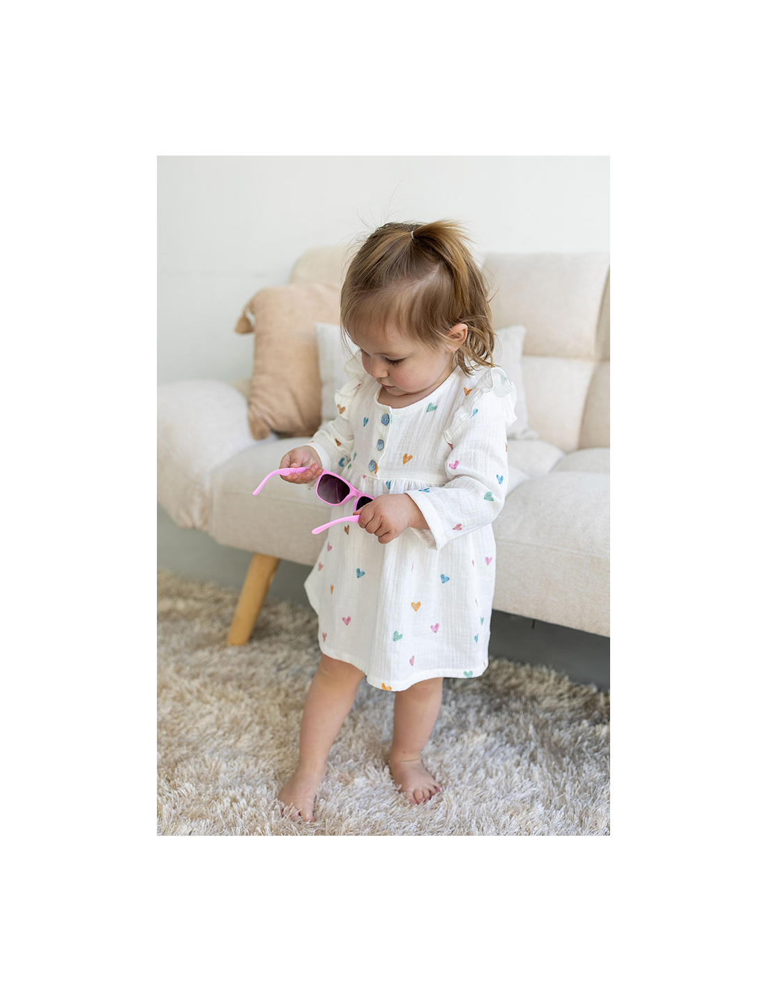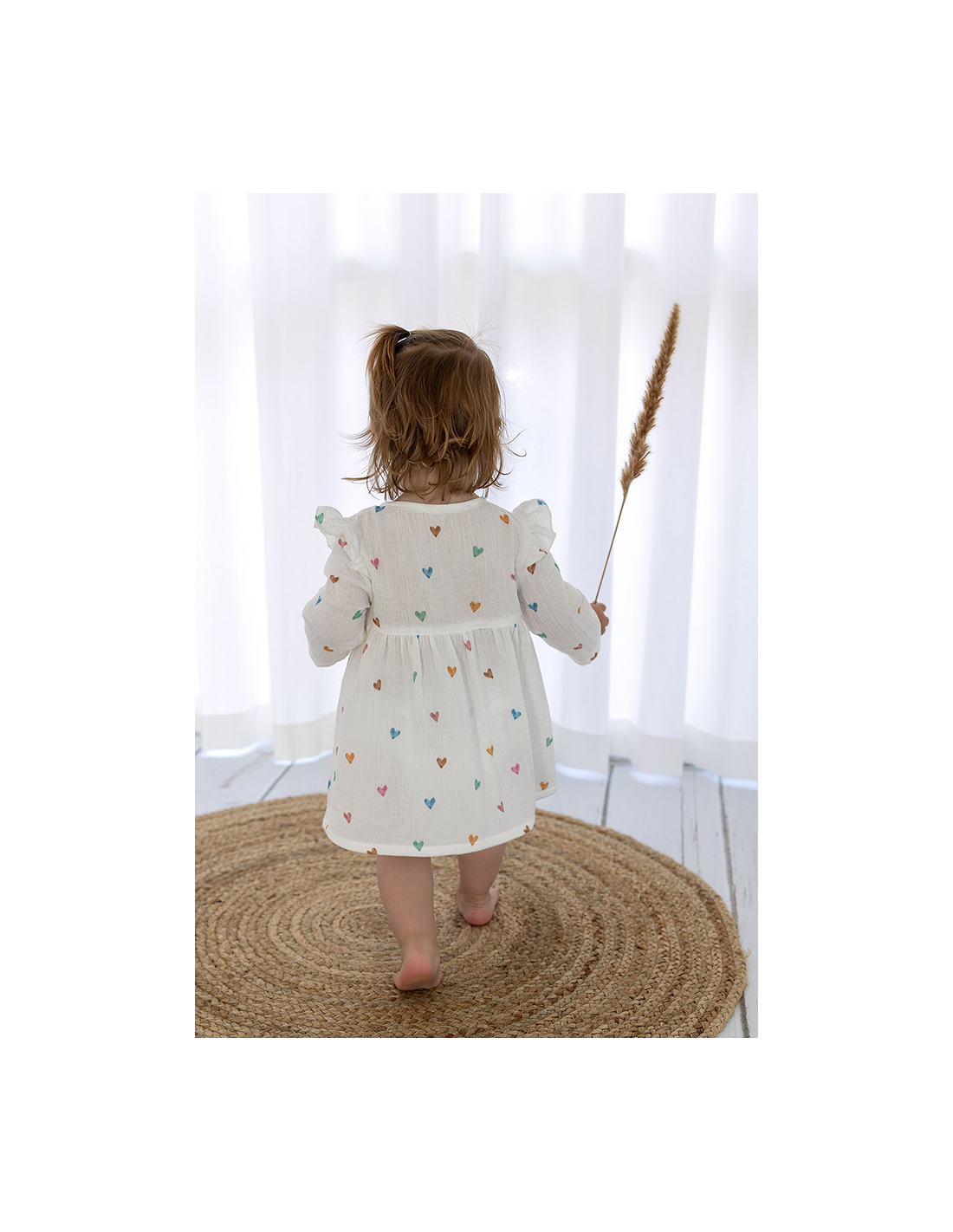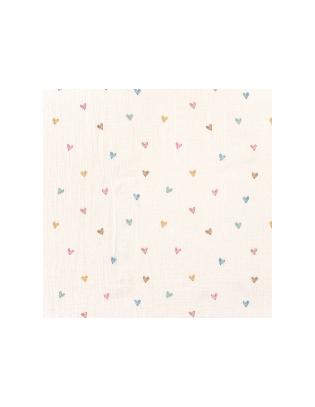 Offwhite muslin med hjärtan i olika färger. Ett lätt luftigt tyg med fin struktur. Användningsområdena är många, till exempel kläder, babyfiltar m.m.
