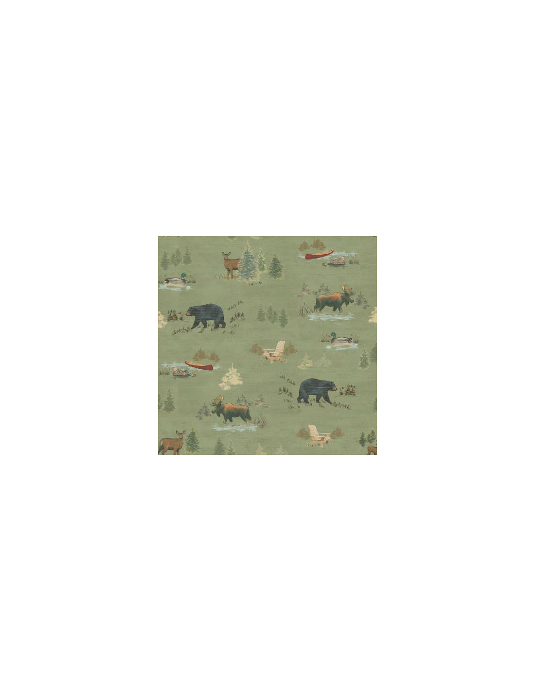 Fånga vildmarkens lugn med detta stämningsfulla bomullstyg från Clothworks. Mönstret tar dig med på ett äventyr genom djupa skogar, där majestätiska älgar, björnar och rådjut samsas med kanoter och stolar vid vattenbrynet. Den dova, skogsgröna basen ger en genuin och naturnära känsla som passar perfekt för projekt med en rustik touch.
