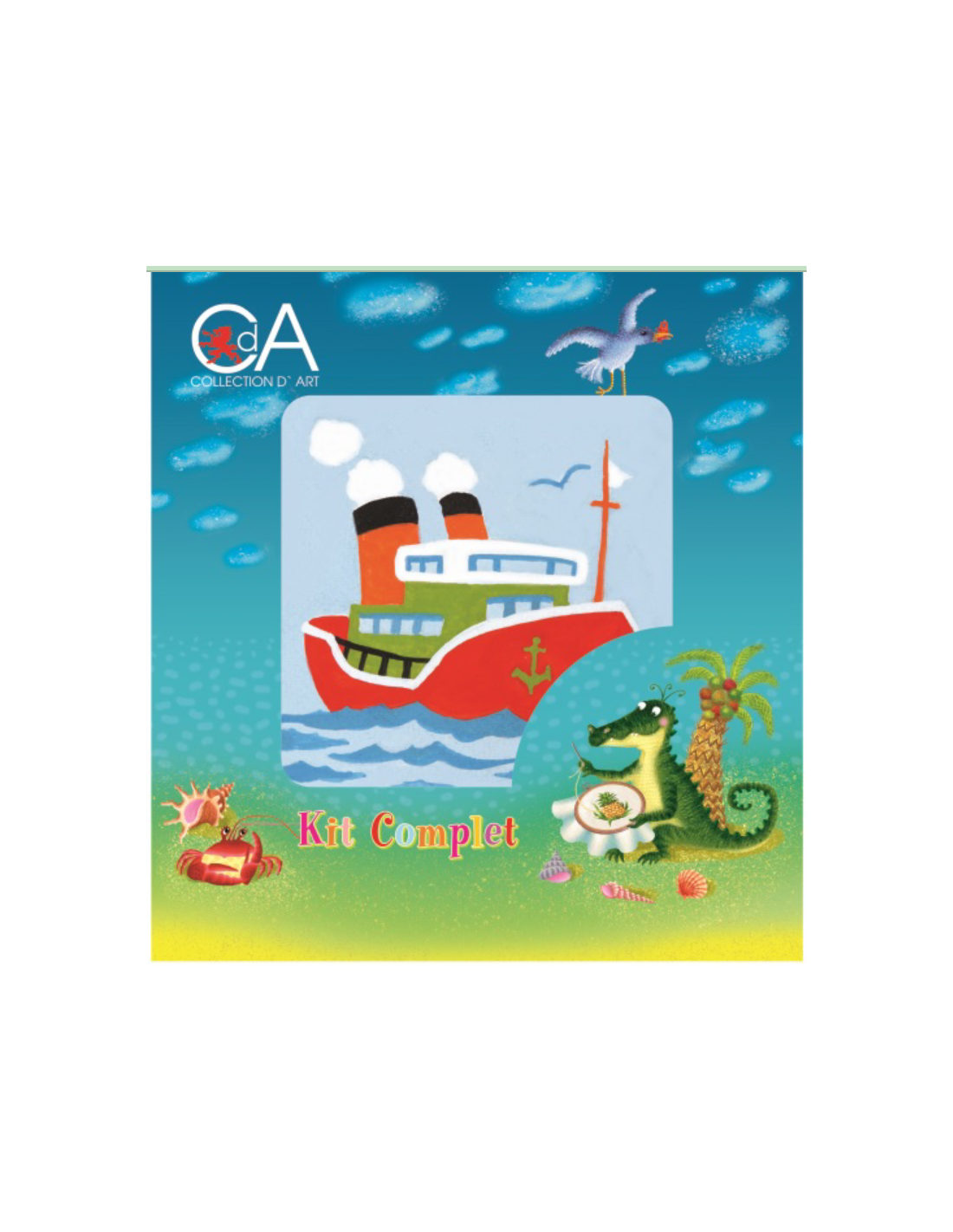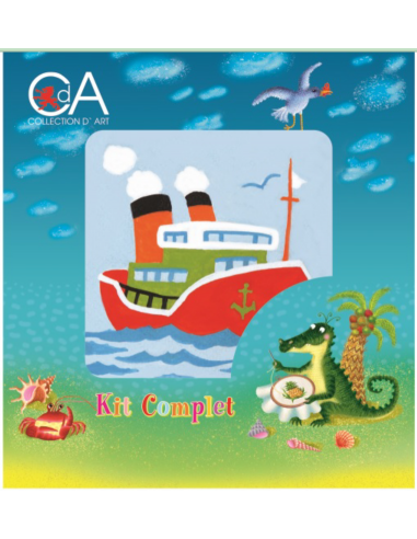 Komplett broderikit för barn med förtryckt canvas (rekommenderad från 7 år). Motivet föreställer en röd och grön båt som tuffar fram på vattnet.