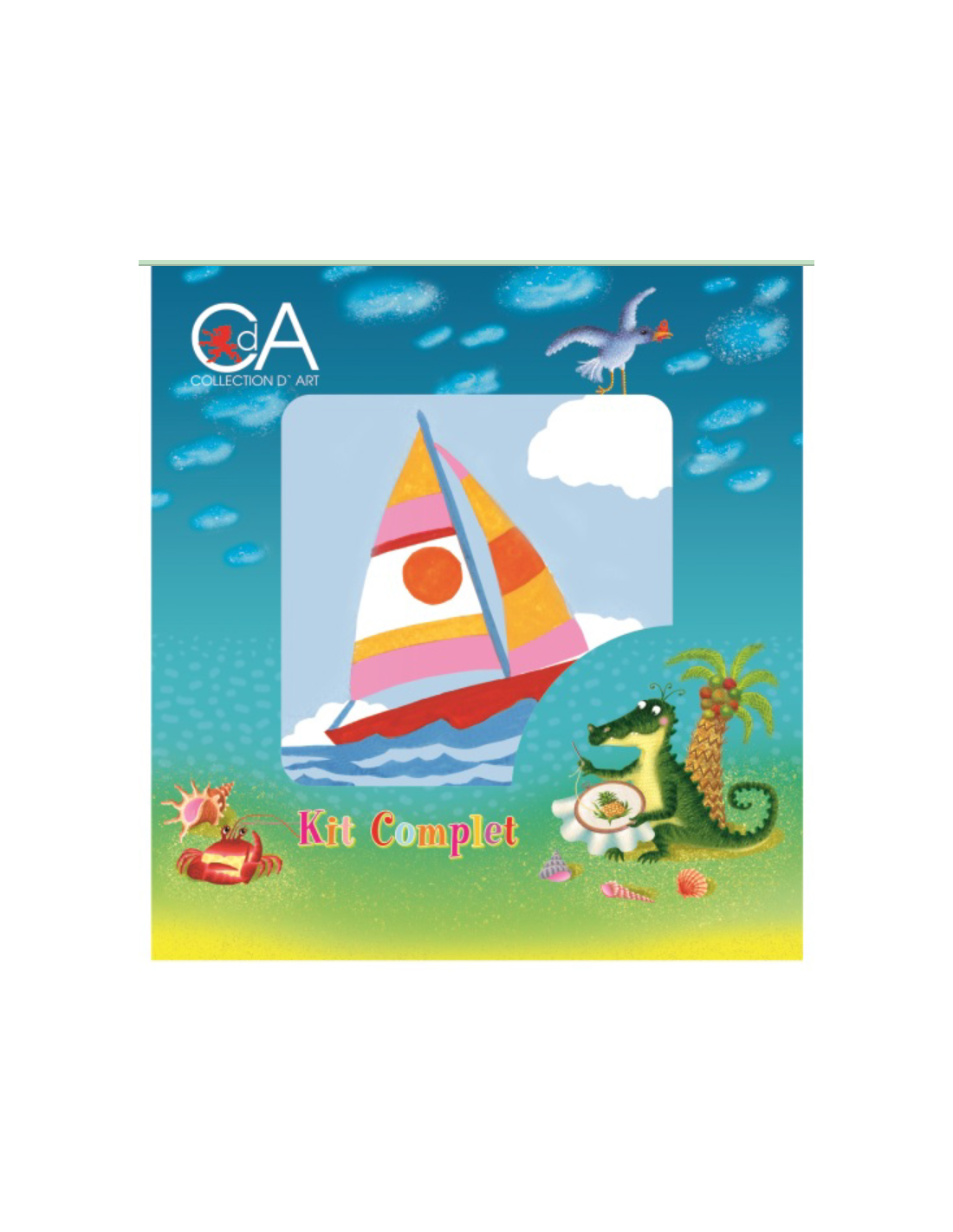 Komplett broderikit för barn med förtryckt canvas (rekommenderad från 7 år). Motivet föreställer en segelbåt med färgglada segel.
