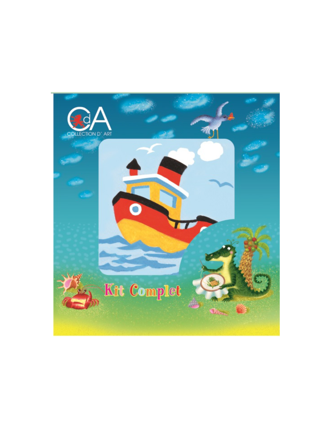Komplett broderikit för barn med förtryckt canvas (rekommenderad från 7 år). Motivet föreställer en gul och röd båt som tuffar fram på vattnet.