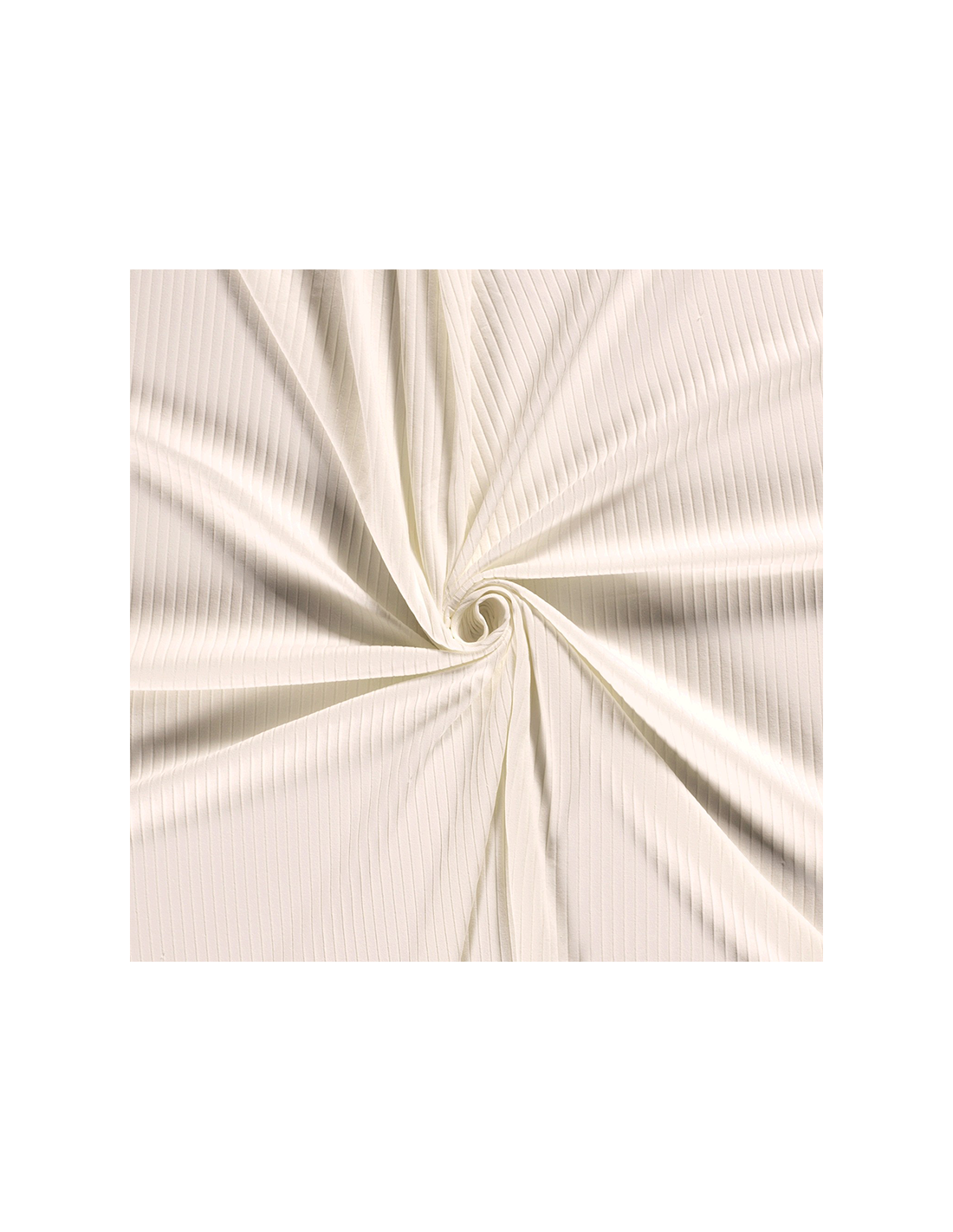Ribbad bomullsjersey i elfenbensvit. Tunt stretchigt och ribbat tyg som lämpar sig bäst till klädsömnad så som t-shirts, klänningar, toppar, leggings m.m.