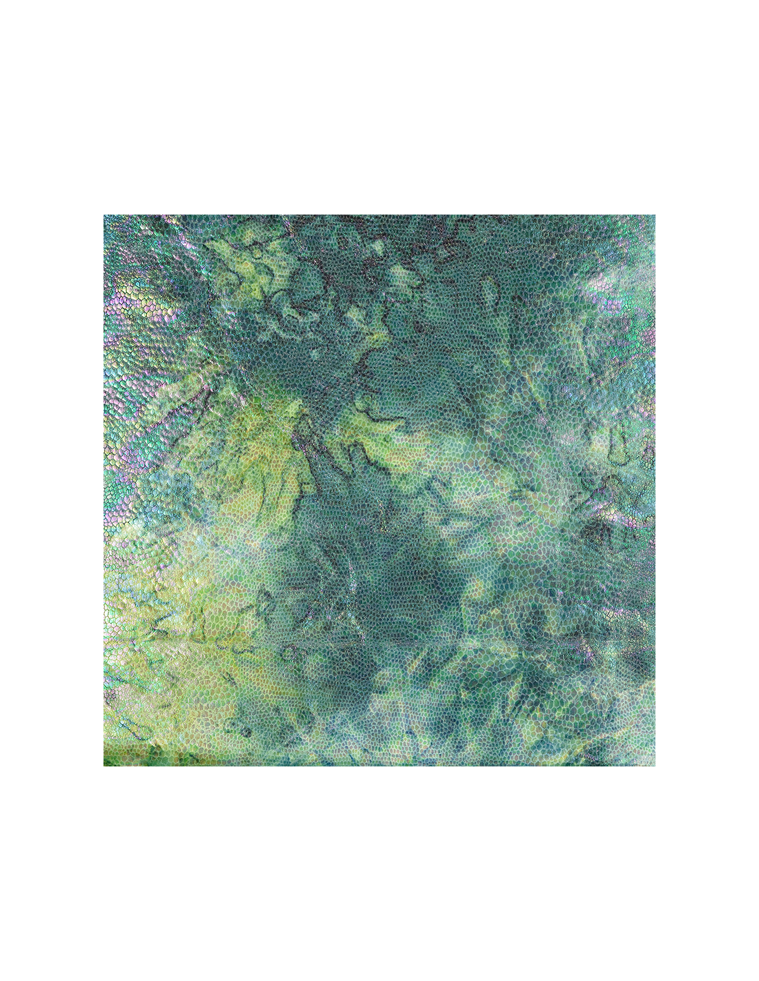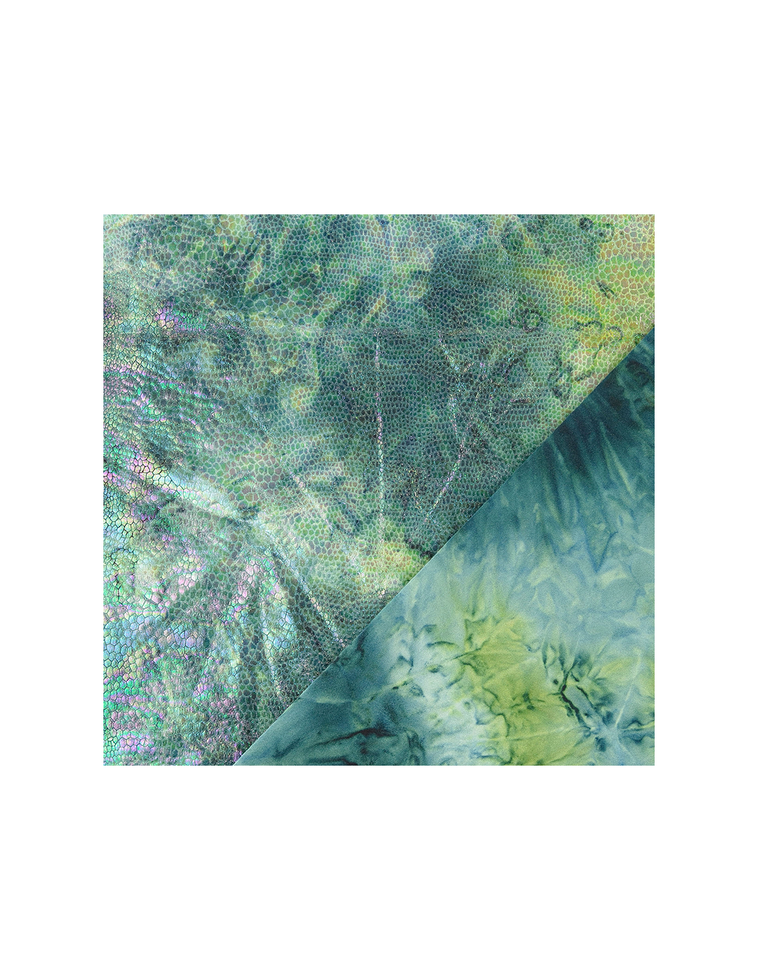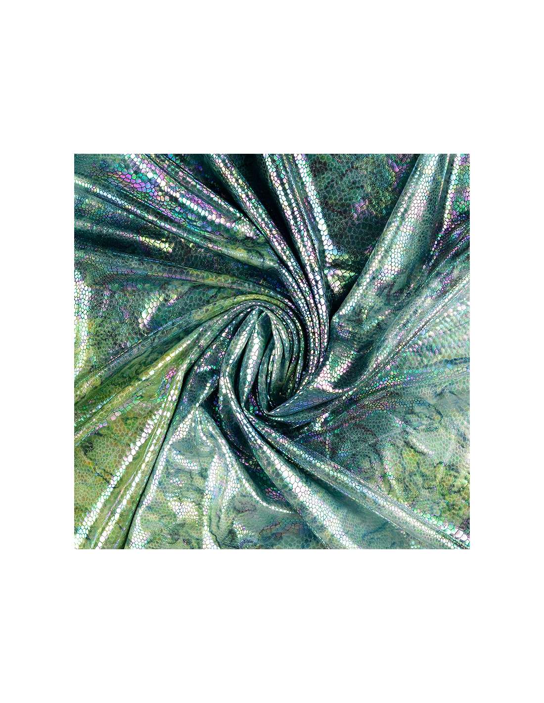 Stretchigt lamé-tyg i grönt med ormskinnsmönster som skimrar i ljuset.