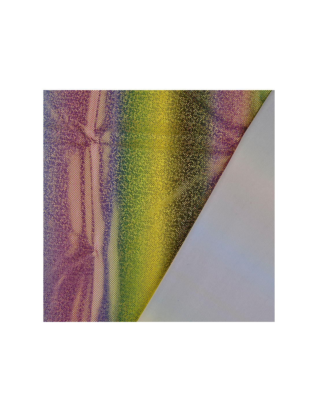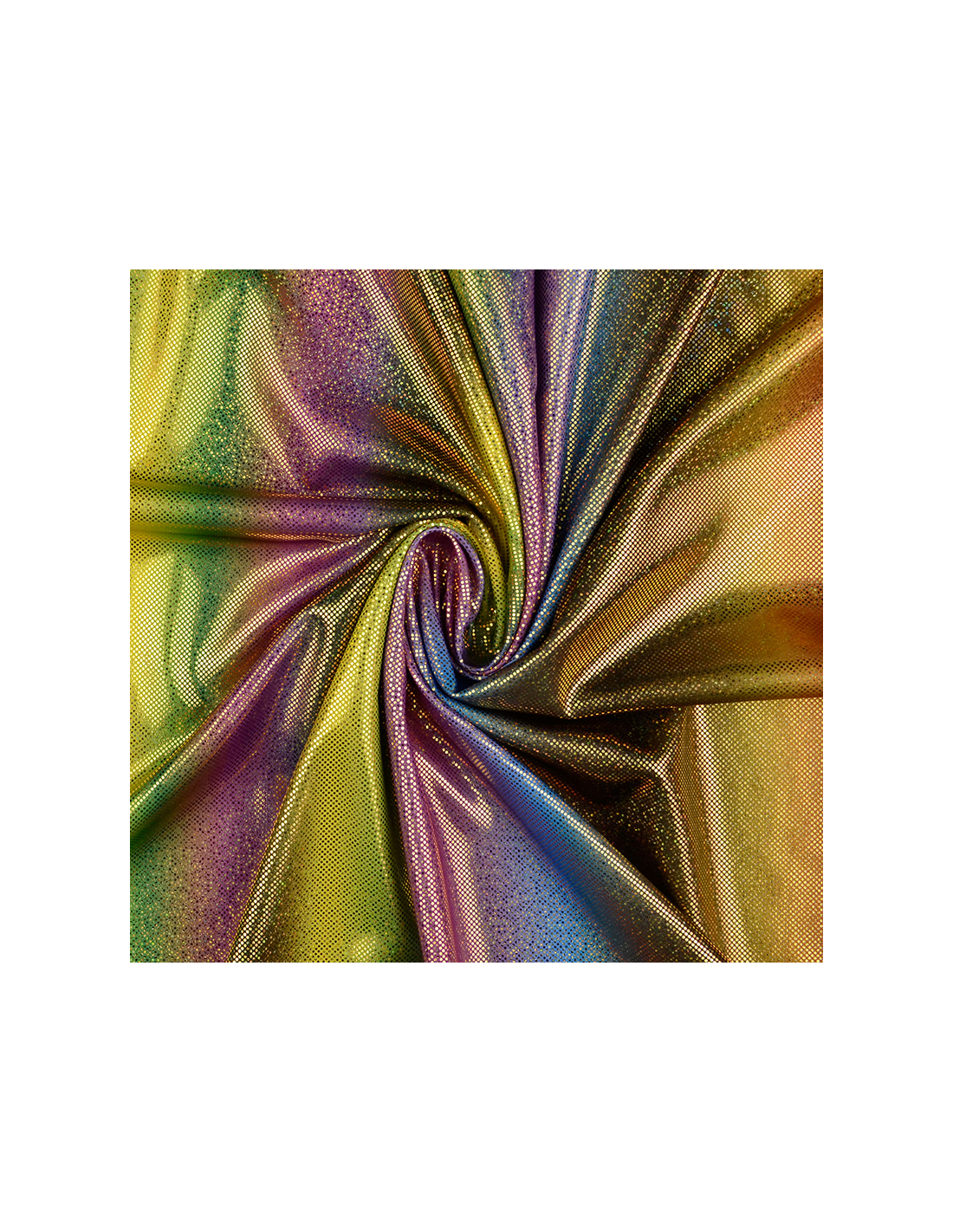 Skimrande tyg i regnbågens alla färger. Ett stretchigt lamétyg med spektakulär, flerfärgad metallicglans som skiftar i ljuset mellan grönt, lila, blått och guld. Perfekt till scenkläder, dansplagg, festtoppar och detaljer som verkligen ska synas. Tyget är följsamt med härlig lyster och ger varje projekt en djärv, futuristisk och glamourös känsla.