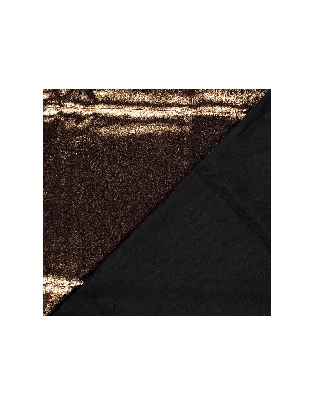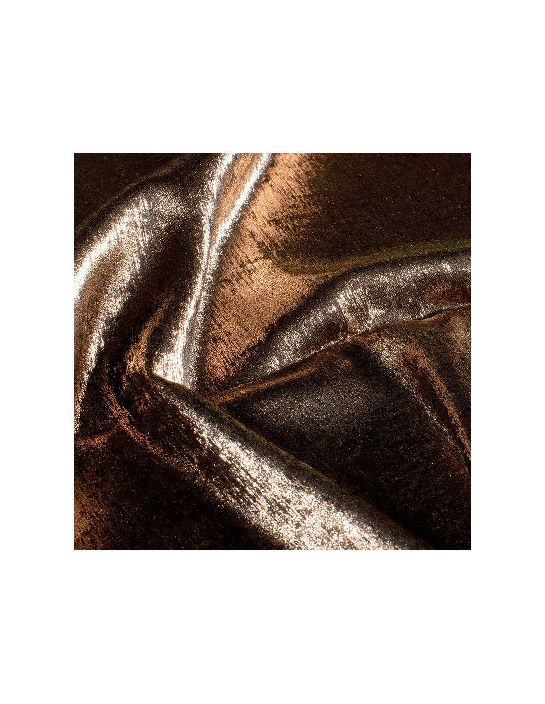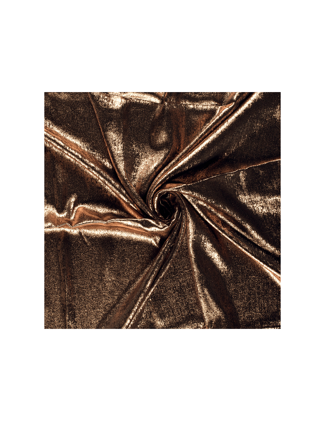 Ett elegant satintyg med vacker foliering i bronston som ger tyget ett exklusivt och skimrande uttryck. Den släta satinbasen har en mjuk lyster medan den bronsfärgade folieringen skapar ett effektfullt djup och ett lyxigt utseende.