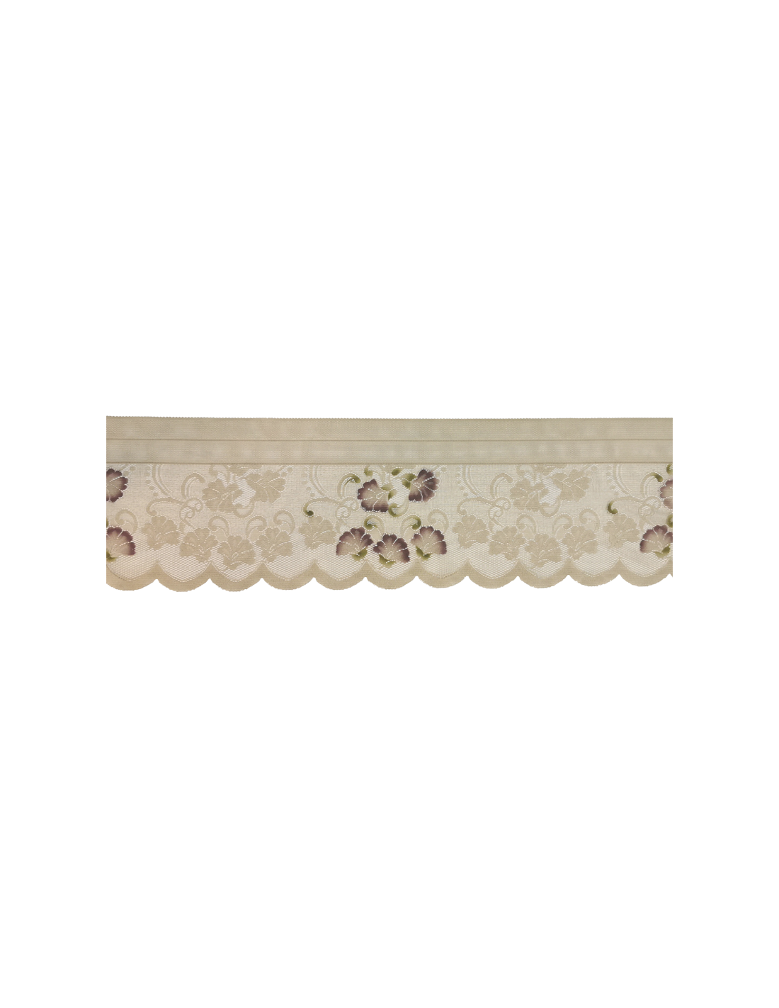 Beige spetskappa på metervara med plommonfärgade blommor. Höjden på kappan är ca 31cm, längden bestämmer du själv. Kappan skickas med ofållade kortsidor, men önskar du dem fållade utan extra kostnad hjälper vi dig med det, ange det som meddelande i kassan vid beställning.
