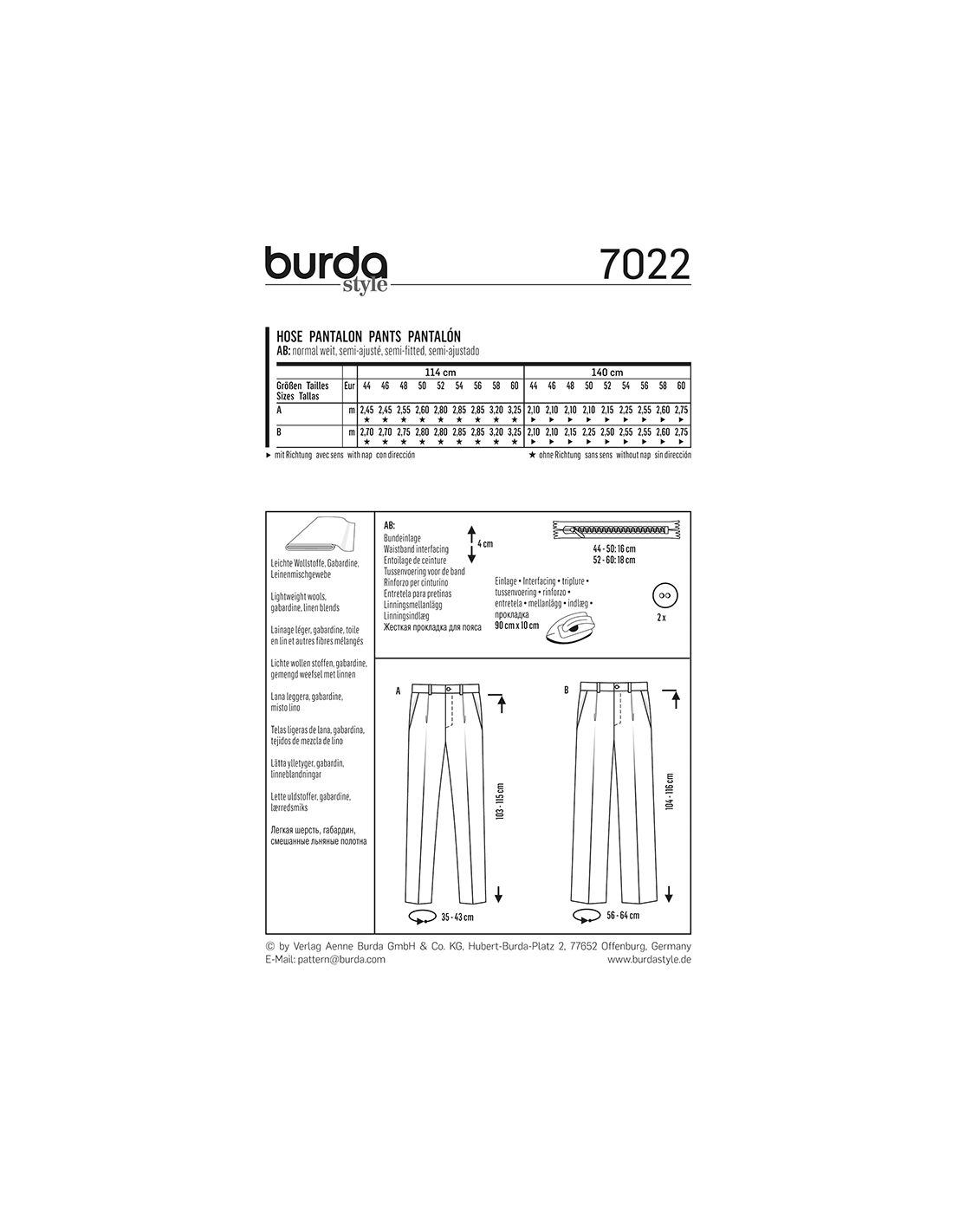 Vill du ha hjälp att tolka tygåtgången? Skicka ett mail till info@tygcenter.se med rubrik Burda 7022 så hjälper vi dig.