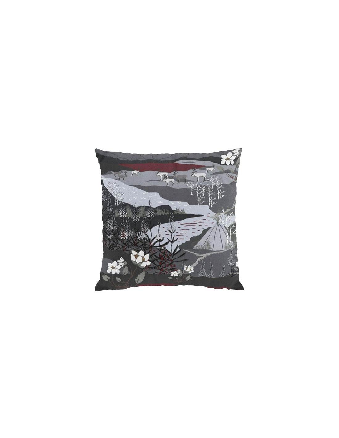 Kuddfodral sytt av tyget Fjällvandring Grå/Vinröd från Arvidssons Textil - ett mönster inspirerat av fjällvärlden med naturen i fokus. Ett stilrent kuddfodral som passar lika fint i vardagsrummet som i fjällstugan.