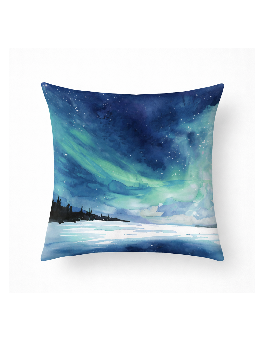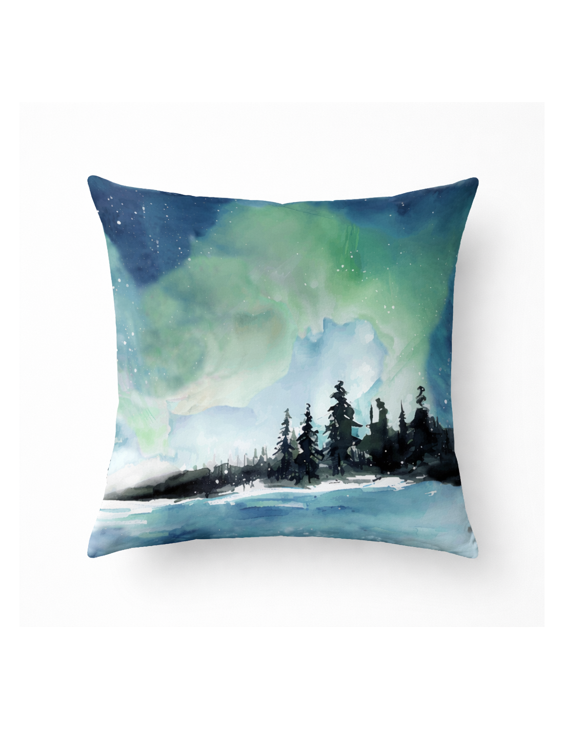 Ge ditt hem en touch av magisk vildmark med detta vackra kuddfodral. Motivet är av ett förtrollande norrsken när det dansar över en silhuett av mörka granar och ett fruset vinterlandskap. De mjuka övergångarna mellan djupt midnattsblått och livfullt smaragdgrönt skapar en rofylld atmosfär i soffan eller sängen.
