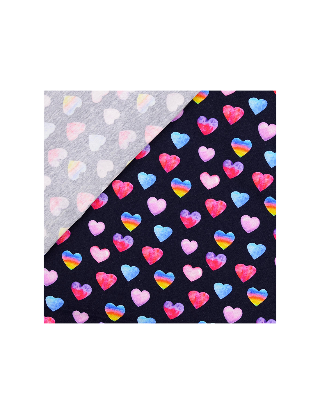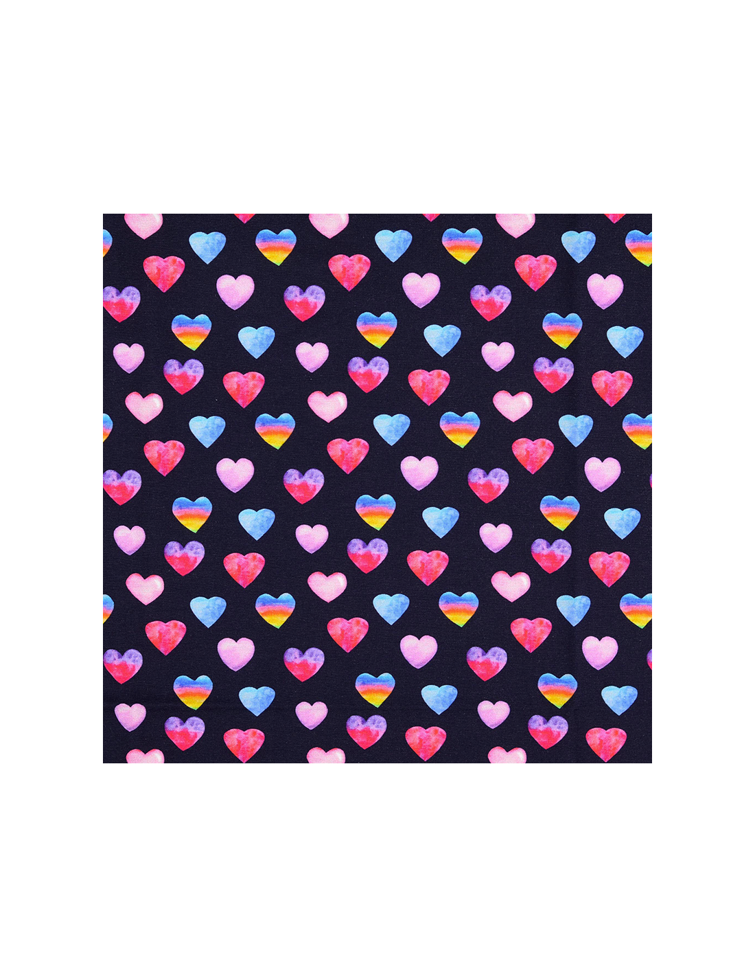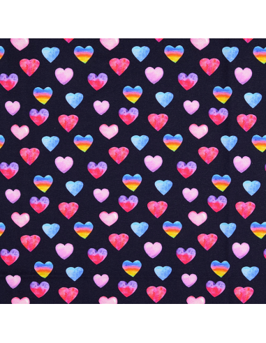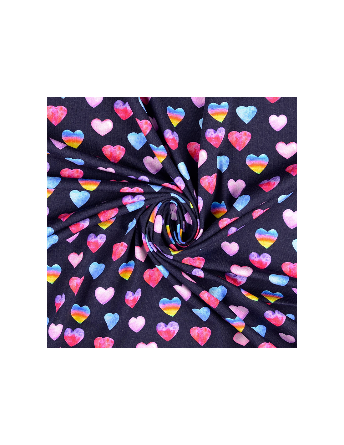 Bomullsjersey svart botten och hjärtan i regnbågens alla förger. Tunt stretchigt tyg som lämpar sig bäst till klädsömnad så som t-shirts, klänningar, toppar, leggings m.m.