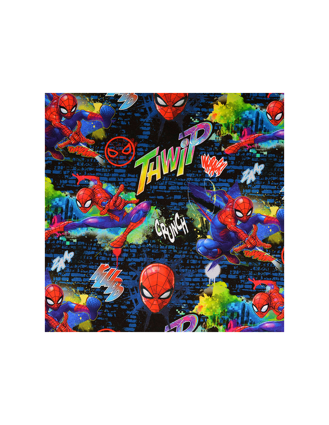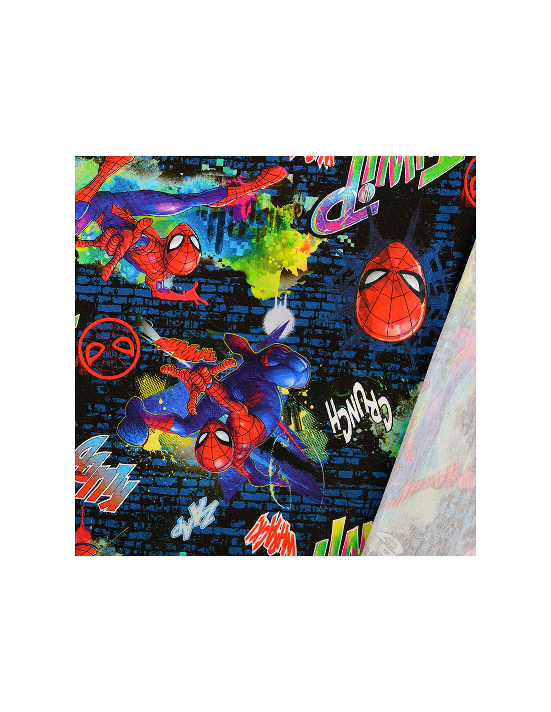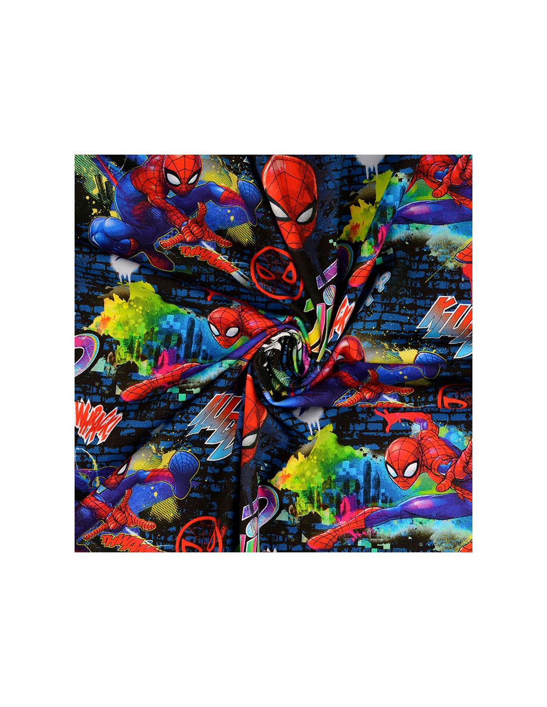 Bomullsjersey svart botten och färgsprakande mönster av Spiderman. Tunt stretchigt tyg som lämpar sig bäst till klädsömnad så som t-shirts, tröjor, klännigar, mössor, leggings m.m.