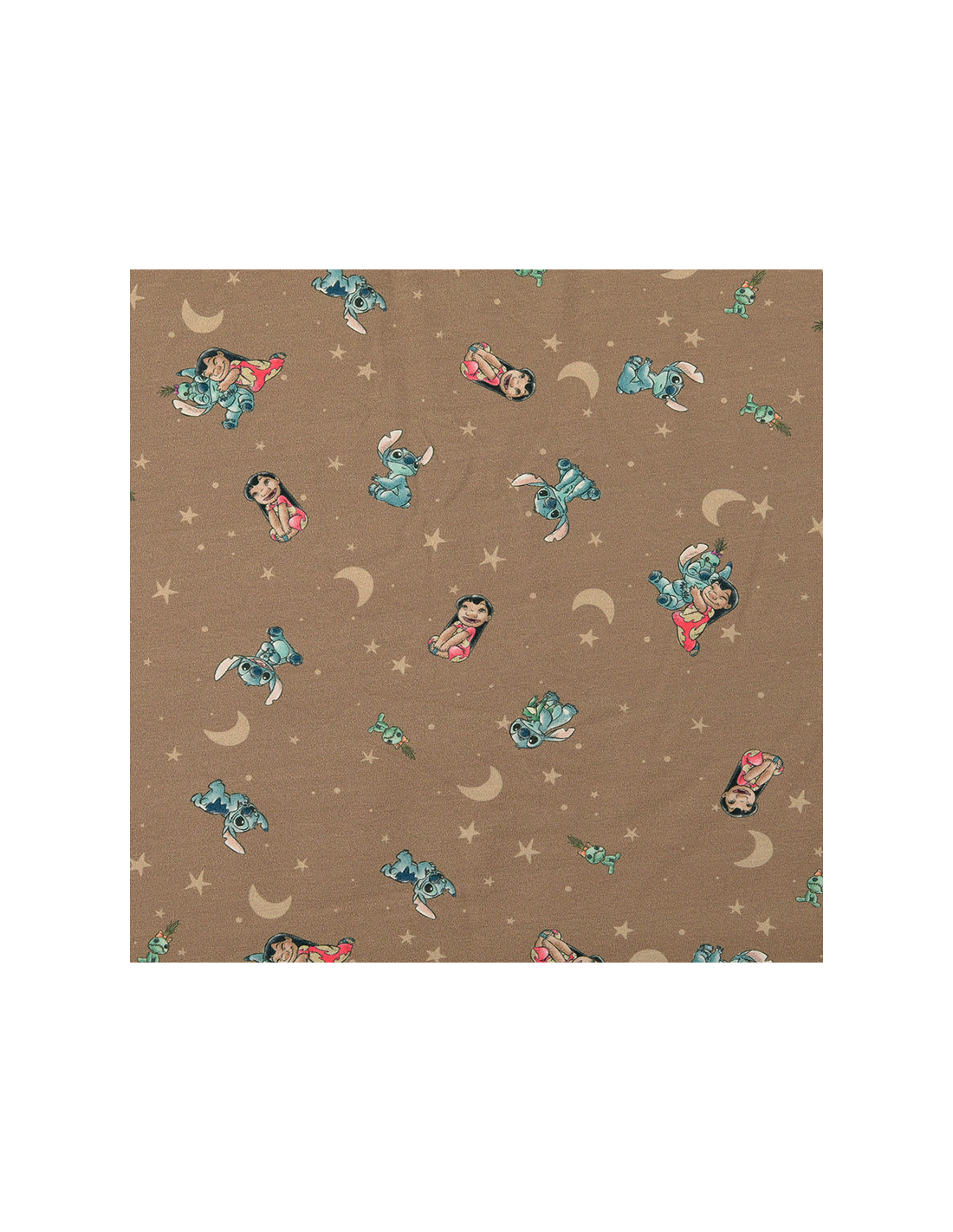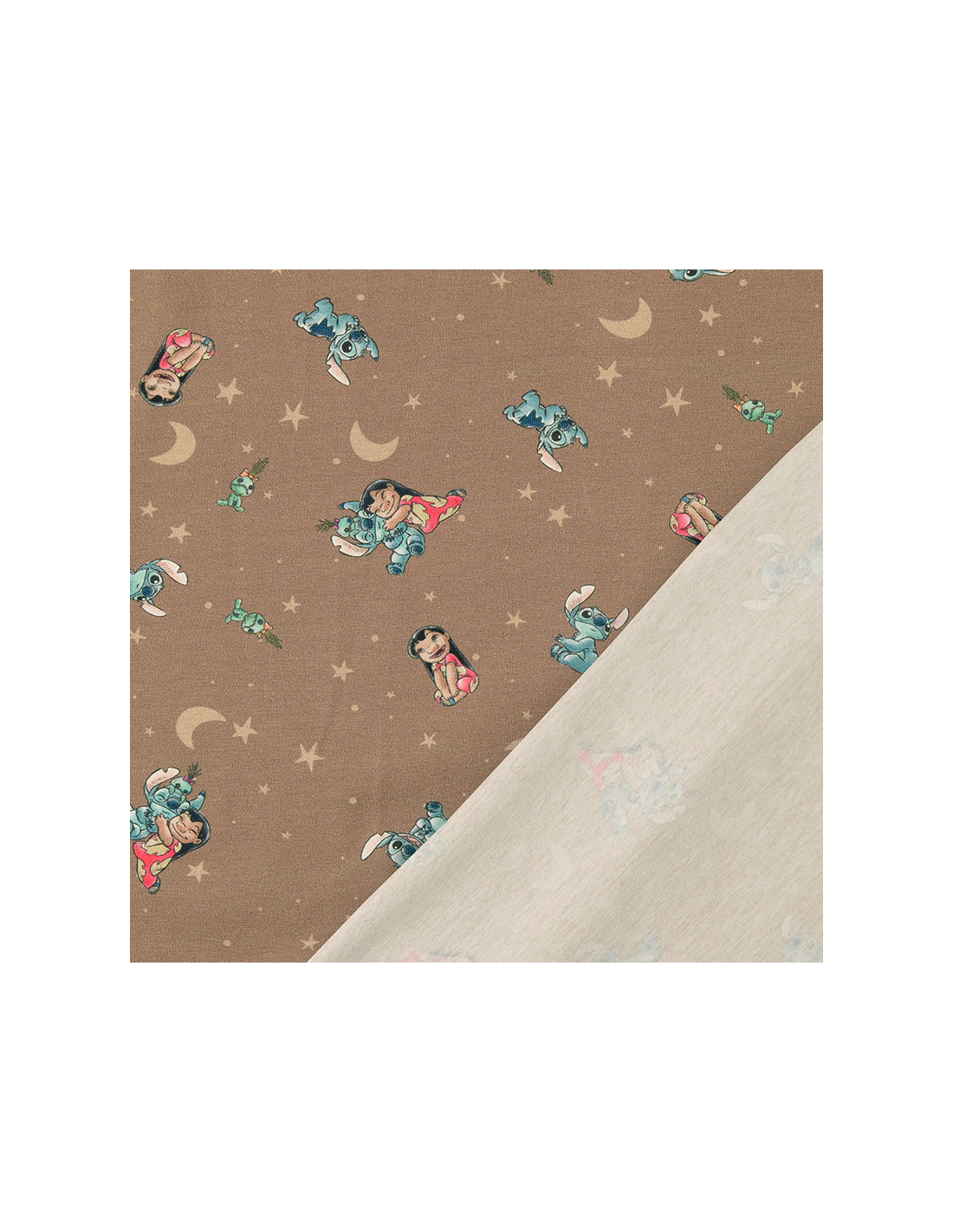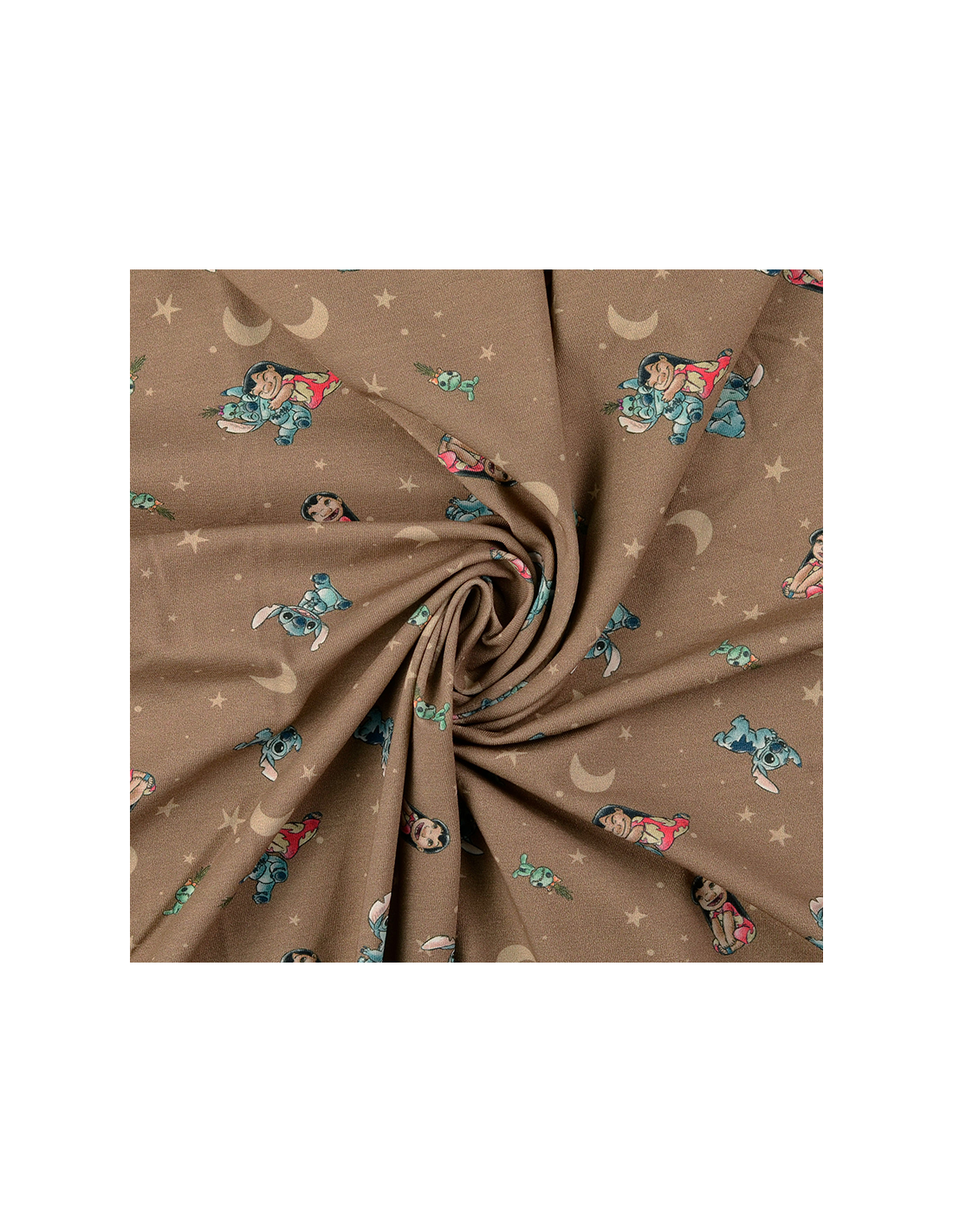 Bomullsjersey med ljust brun botten och mönster av Lilo och Stitch. Tunt stretchigt tyg som lämpar sig bäst till klädsömnad så som t-shirts, tröjor, klänningar, mössor, leggings m.m.