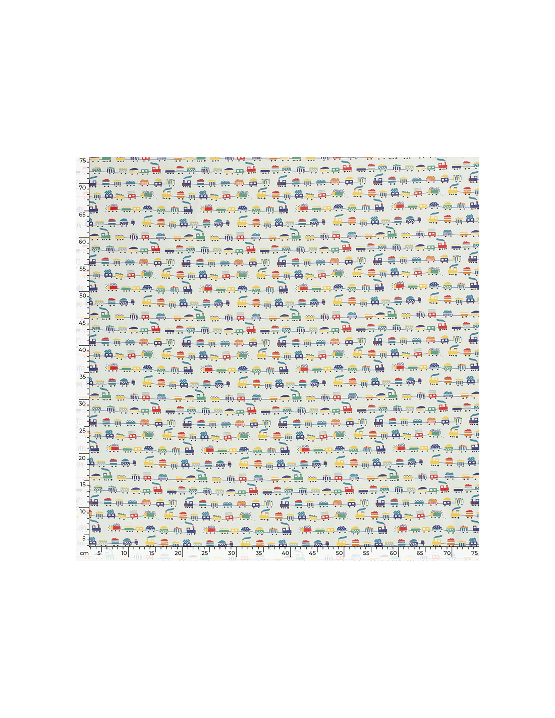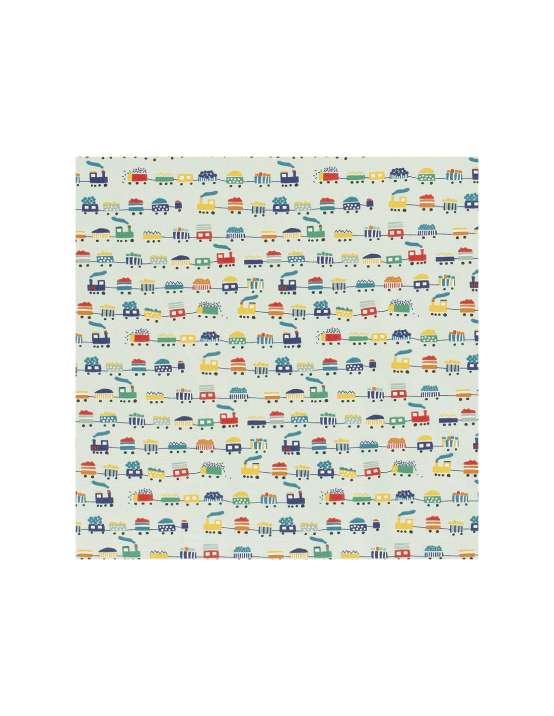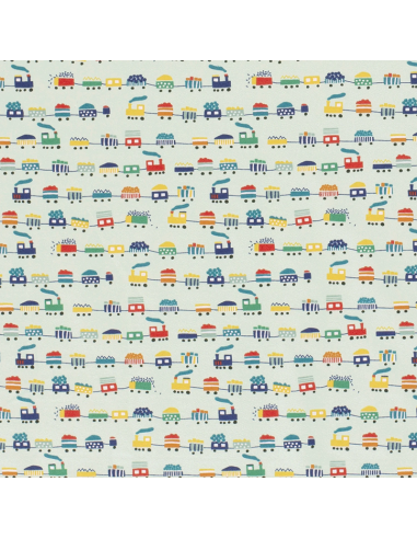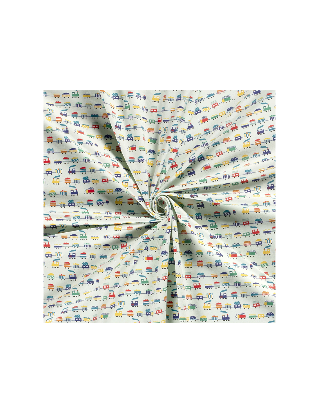 Mintgrön bomullsjersey med tåg. Lämpar sig bäst till klädsömnad så som t-shirts, mössor, klänningar m.m.