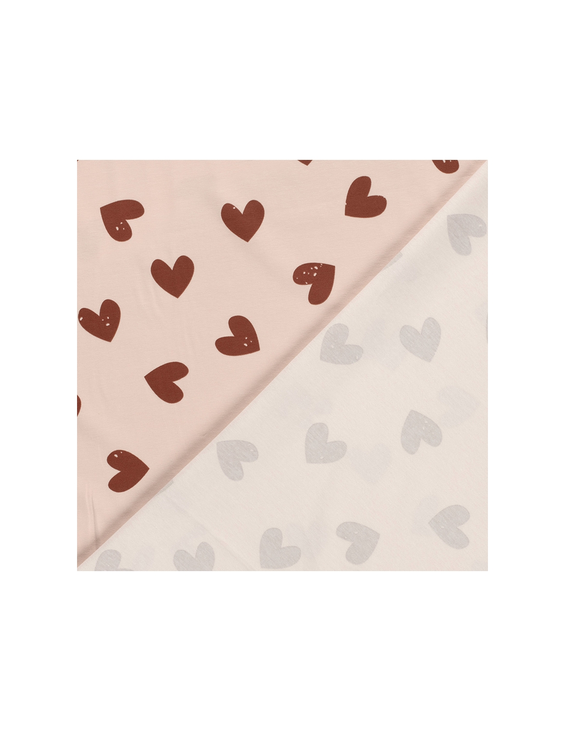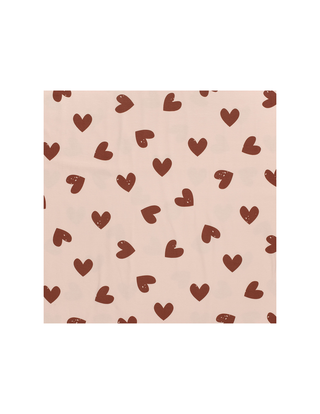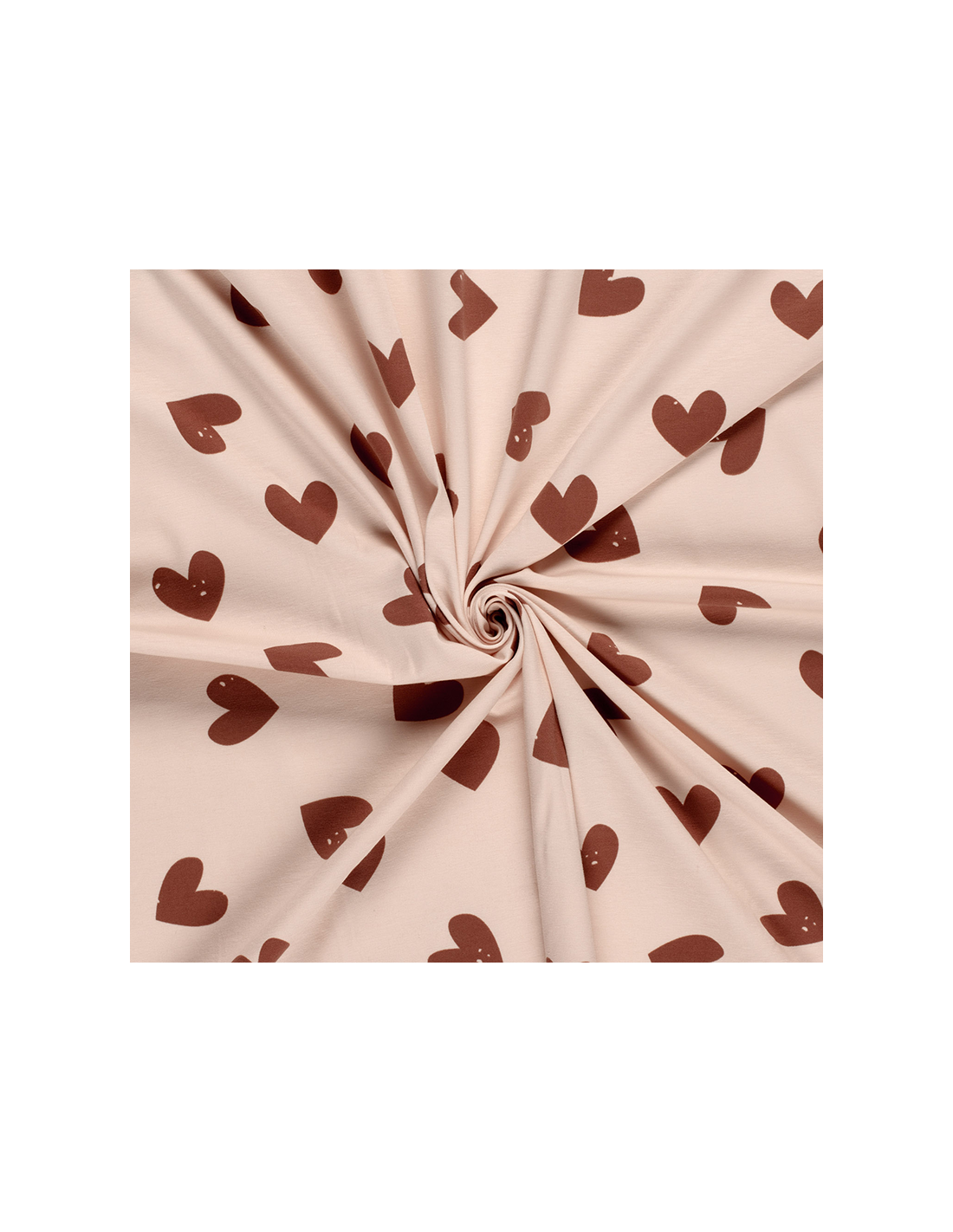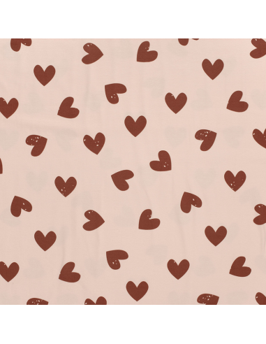 Ljust rosa bomullsjersey med hjärtan i mörkrött. Tunt stretchigt tyg som lämpar sig bäst till klädsömnad så som t-shirts, klänningar, toppar, leggings m.m.