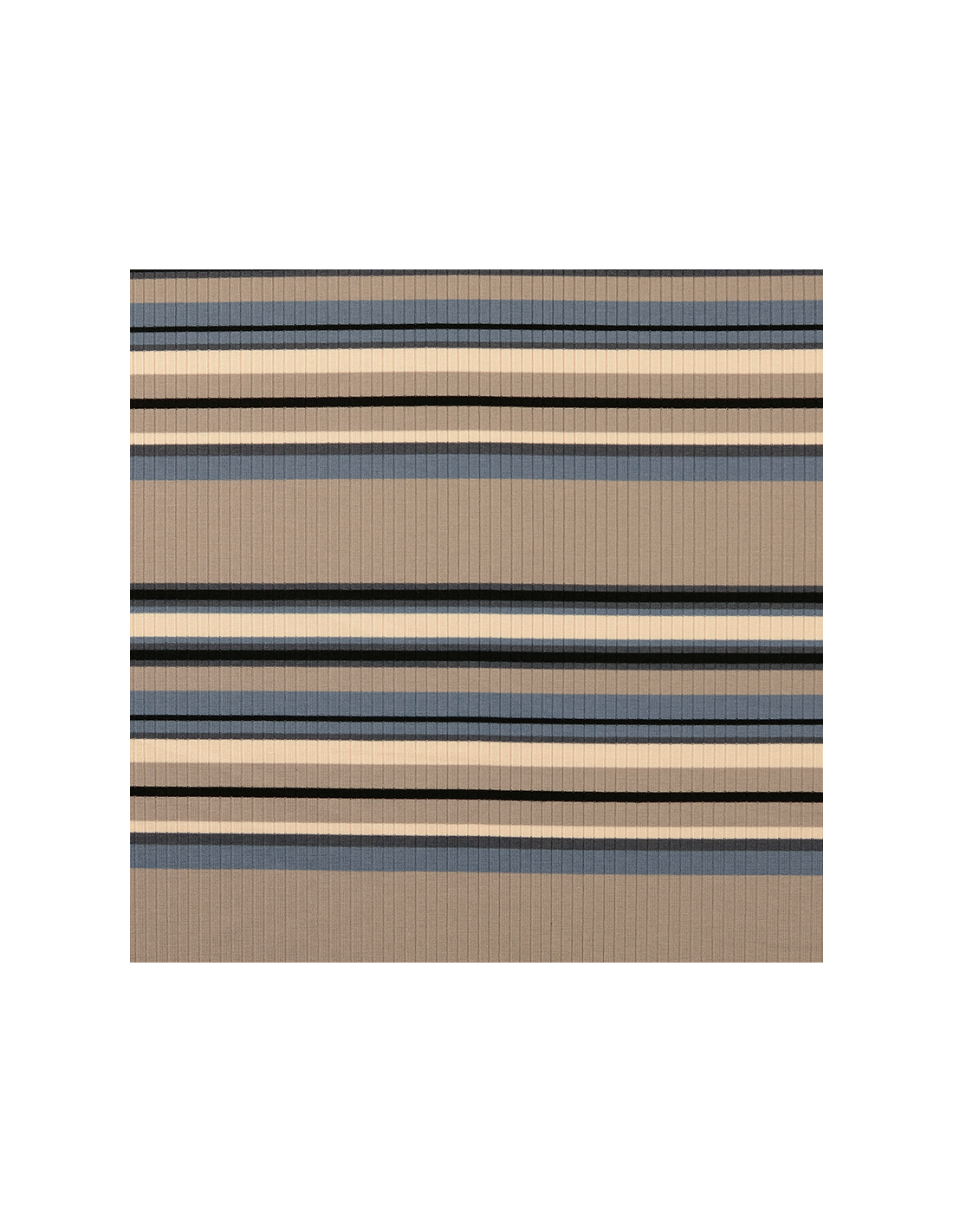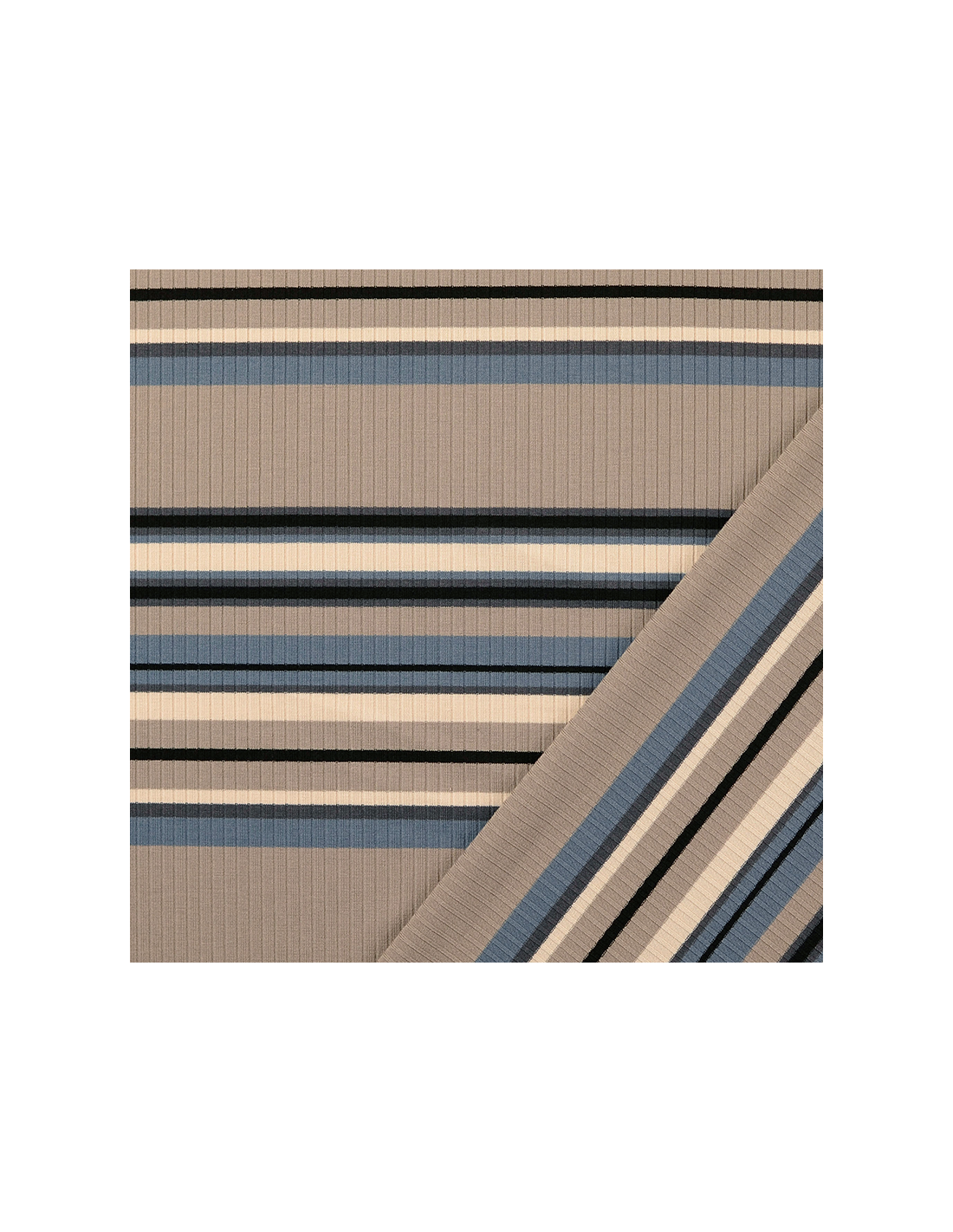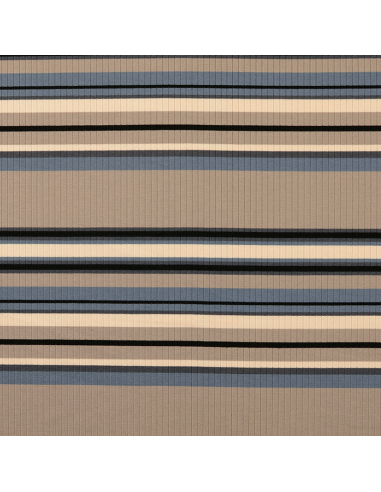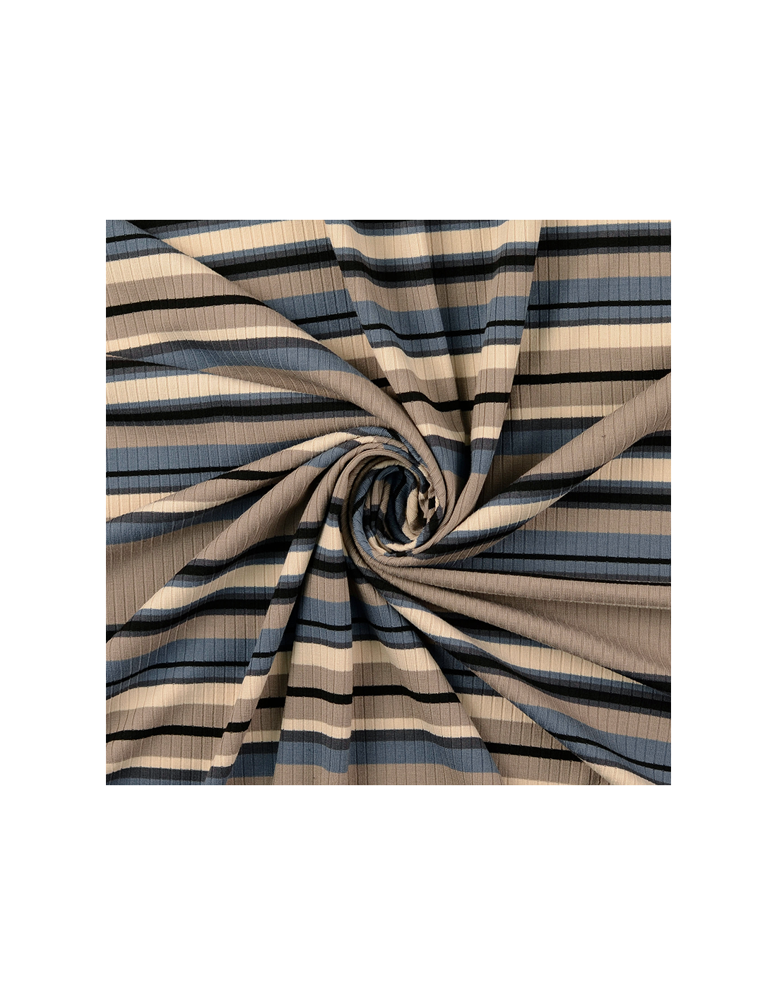 Beige ribbad jersey med ränder i blått, svart och vitt. Stretchigt och ribbat tyg som lämpar sig bäst till klädsömnad så som t-shirts, klänningar, toppar m.m.