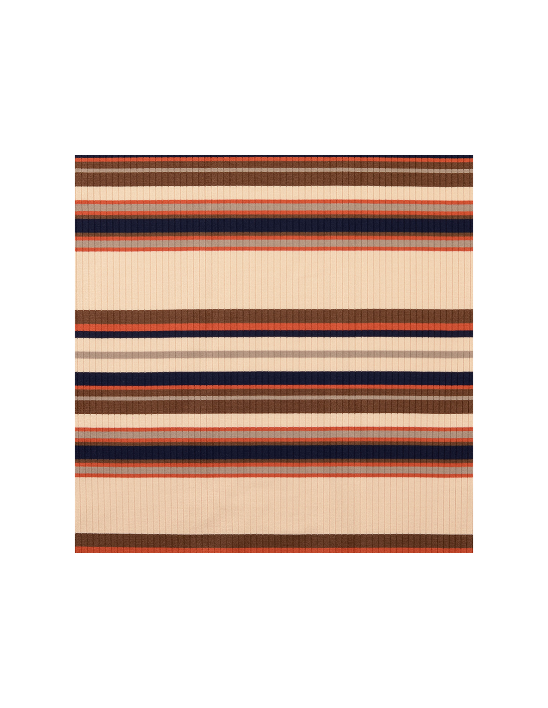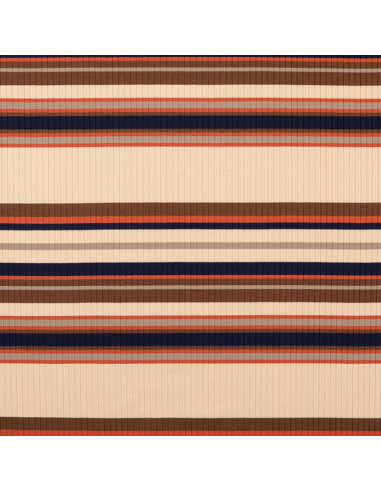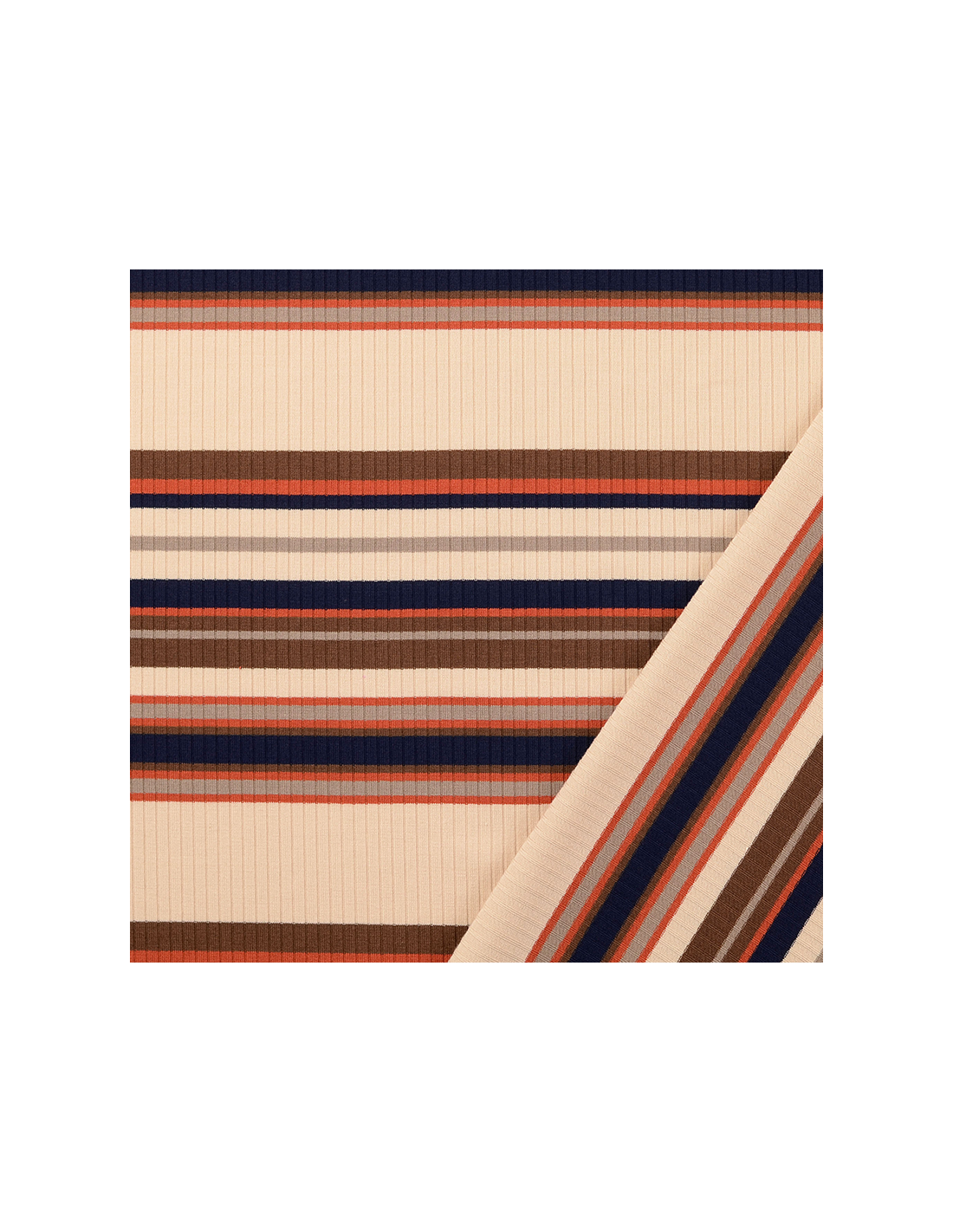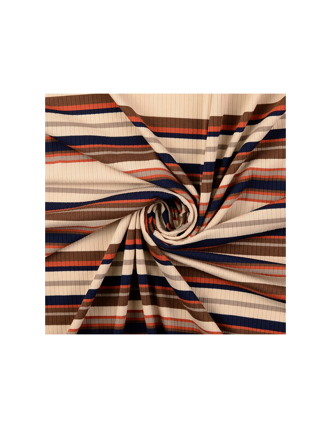 Ljust beige ribbad jersey med ränder i terracotta, brunt och marinblått. Stretchigt och ribbat tyg som lämpar sig bäst till klädsömnad så som t-shirts, klänningar, toppar m.m.