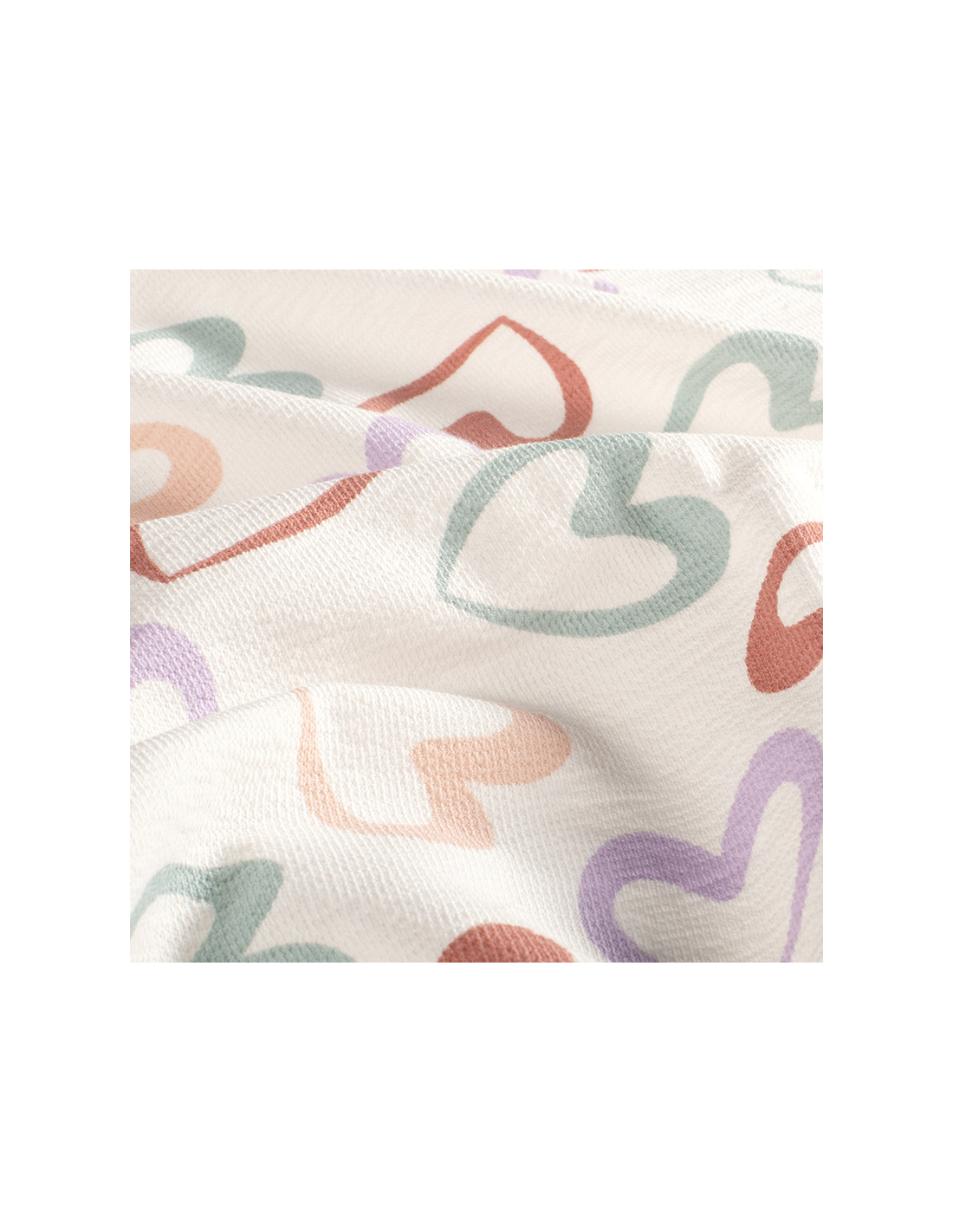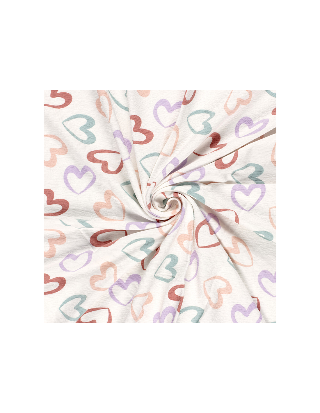 Ett mjukt och följsamt terry crepe-tyg med offwhite botten och lekfulla hjärtan i olika färger. Tyget är stickat med en lätt strukturerad crepe-yta på framsidan och en mjuk öglad baksida likt french terry. Den fina strukturen ger tyget ett livfullt uttryck samtidigt som det är stretchigt och skänt att bära. Perfekt till tröjor, klänningar, set och barnkläder där du vill kombinera komfort med ett glatt charmigt mönster.