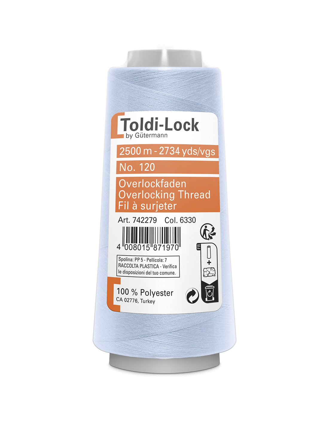2500 meter overlocktråd från Gütermann, färgnummer 6330, ljusblå.