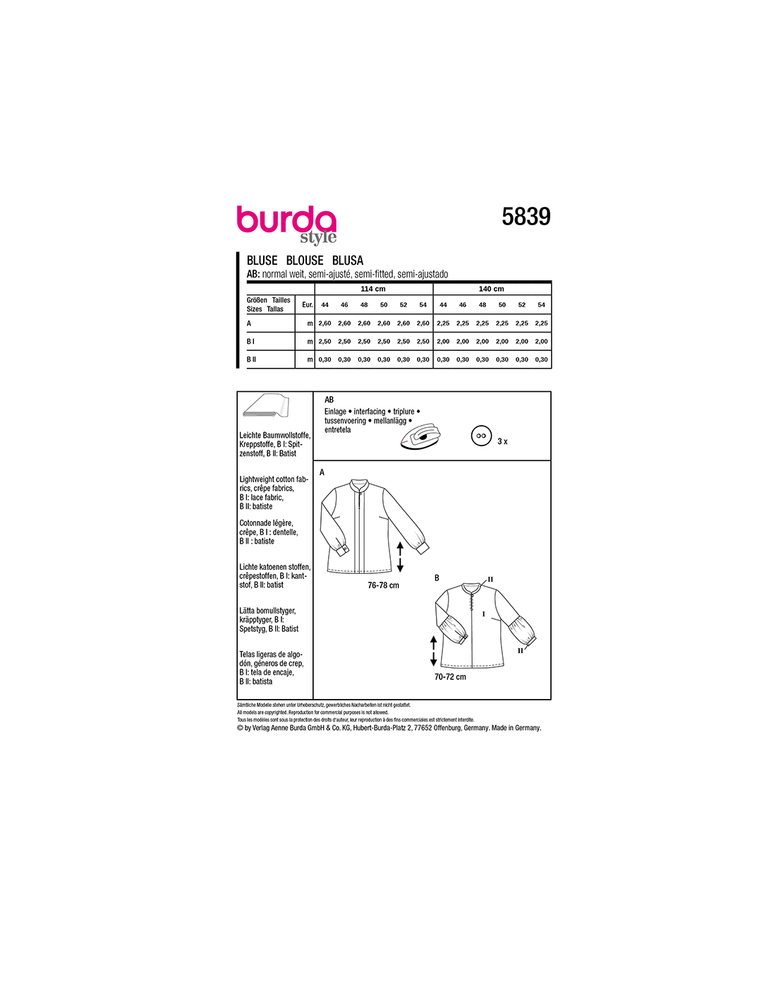 Vill du ha hjälp att tolka tygåtgången? Skicka ett mail till info@tygcenter.se med rubrik Burda 5839 så hjälper vi dig.
