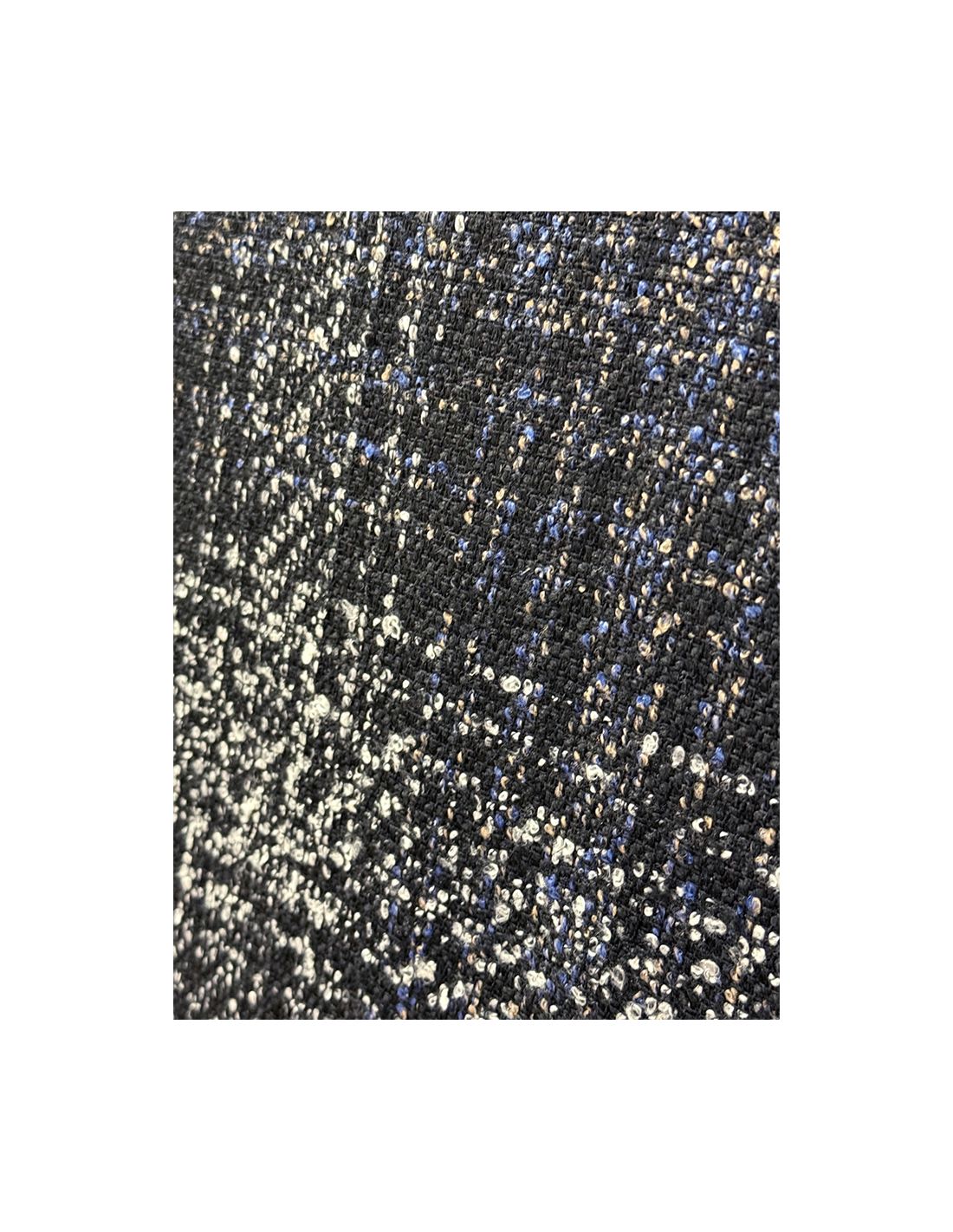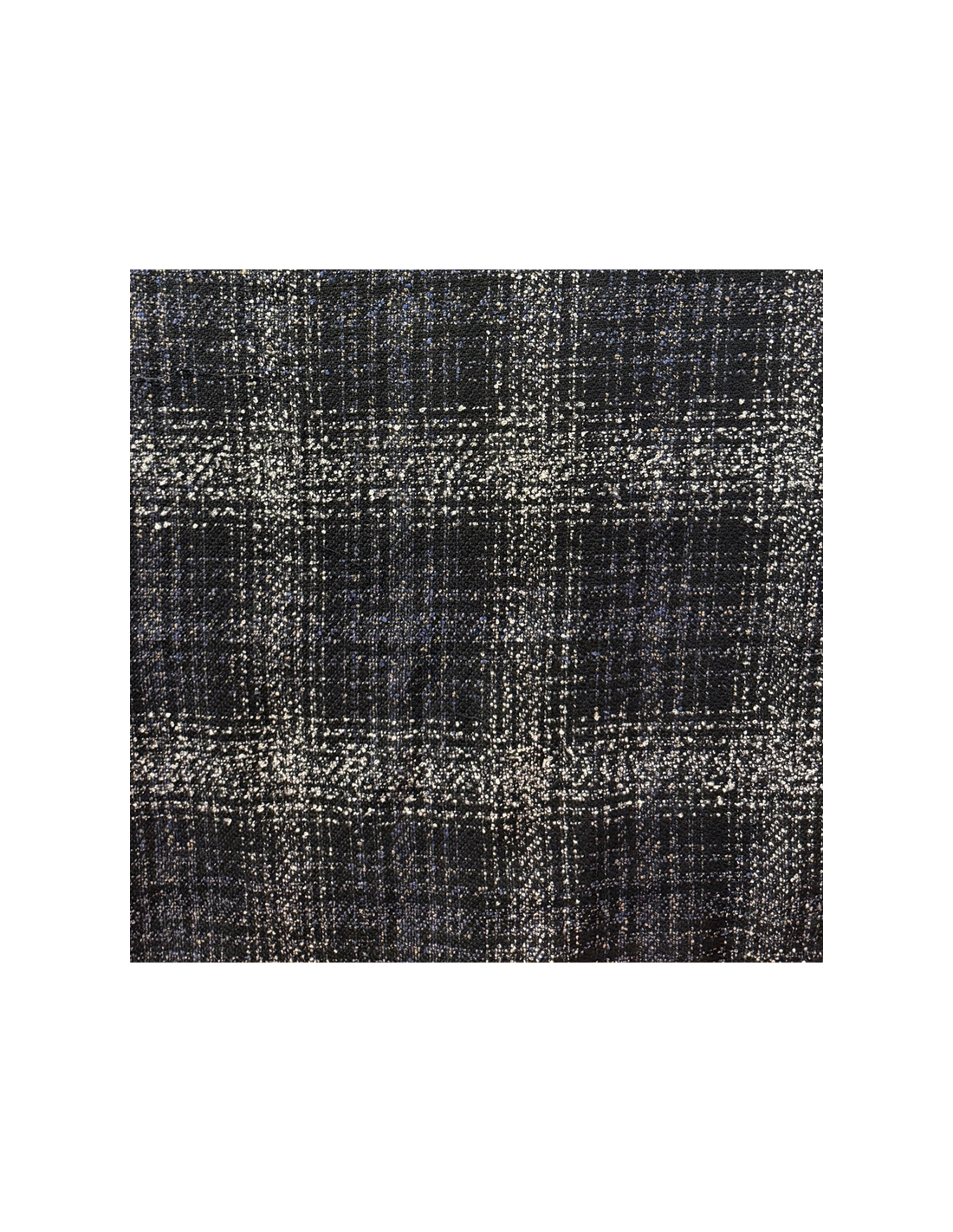 Bouclé tyg i svart med vitt rutigt mönster och inslag av blått och ljusbrunt/beige. Kan användas till klädsömnad så som jackor, dräkter, kjolar m.m, men även till heminredning som till exempel kuddfodral.