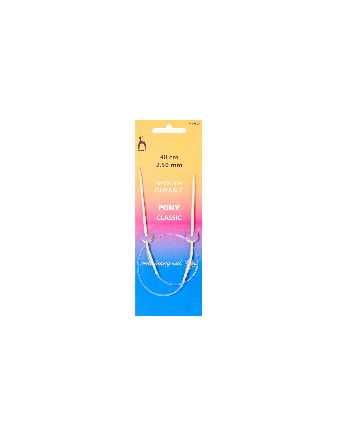 Rundsticka 40cm 2.5mm från Pony. Precis som strumpstickor är rundstickor lämpliga till runda stickprojekt, men fördelen med rundstickor är att de sitter ihop med en kabel. Används till exempel till mössor och tröjor.