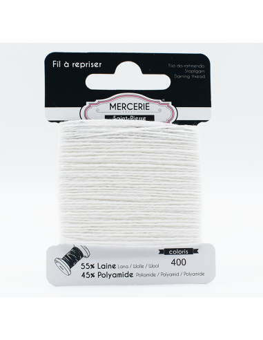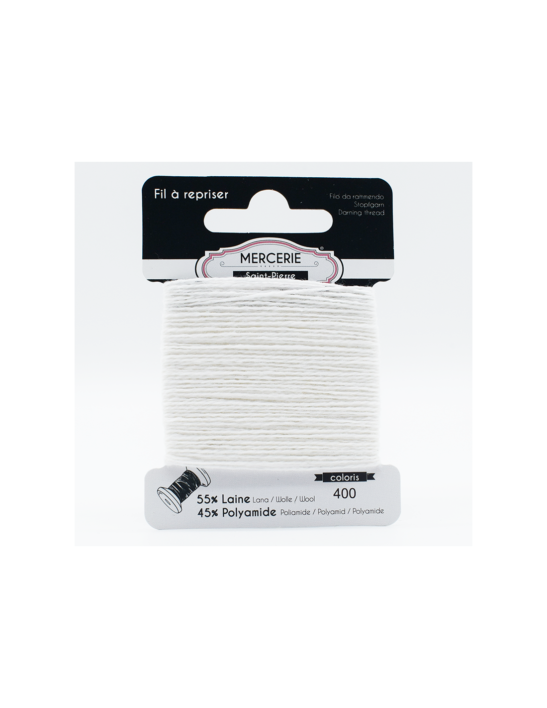 Vitt stoppgarn i en blandning av ull och akryl, för lagning av hål i stickade plagg och tyger.