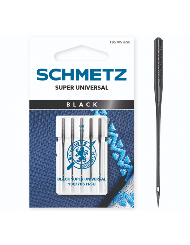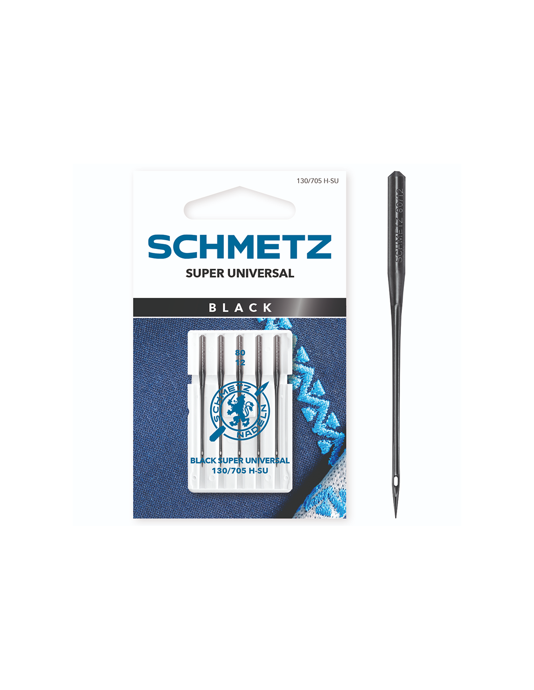 Super universalnålar från Schmetz med non-stickyta som förhindrar att limrester fastnar på nålen. Nålen har ett längre och bredare öga för enkel trädning och minskad friktion. 5-pack symaskinsnålar med lätt rundad spets för sömnad i många olika kvaliteter.
