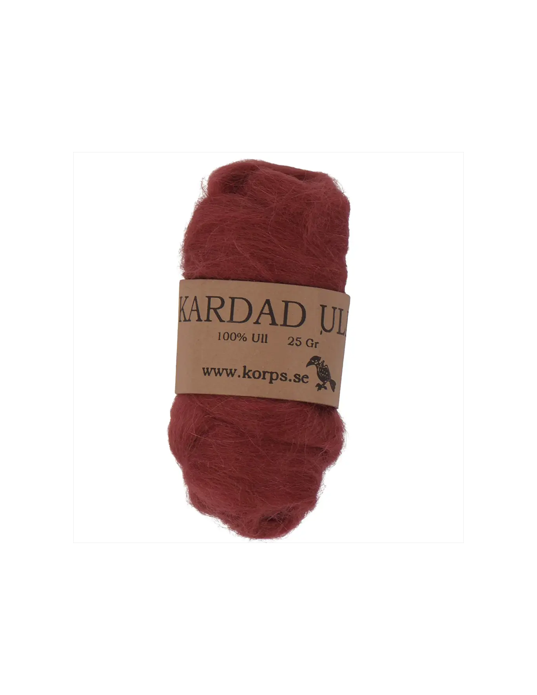 Vinröd kardad ull från Korps. Idealisk för både våt- och torrtovning, lättanvänt till alla typer av tovningsprojekt, för både nybörjare och erfarna användare.